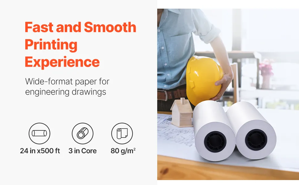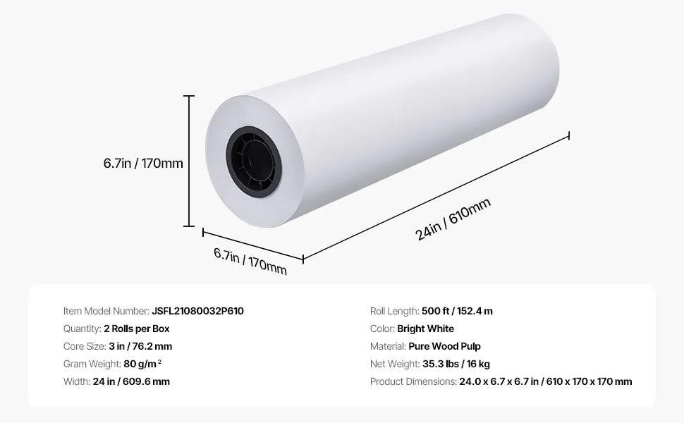 Rolki standardowego formatu: Ten papier wielkoformatowy jest dostarczany w pudełku z dwiema rolkami, każda o szerokości 61 cm i długości 152,4 m. Zapewnia precyzyjne, ciągłe wydruki, idealne do wielkoformatowych rysunków technicznych i projektów architektonicznych. Rdzeń o średnicy 76,2 mm (3 cale) pasuje do większości standardowych drukarek inżynieryjnych.