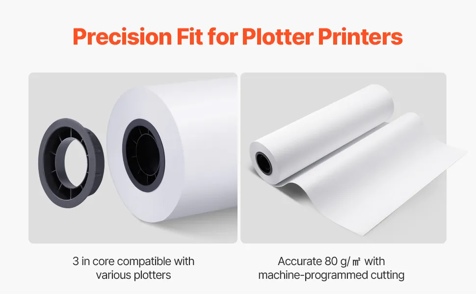Precyzyjna kontrola gramatury: Nasz papier do plotera wykorzystuje nowe, programowane maszynowo obliczenia długości, które zapewniają większą dokładność niż starsze metody cięcia. Gramatura 80 g/m² i precyzyjna długość gwarantują zgodność ze specyfikacjami rozmiaru drukarki, co zapewnia płynne podawanie papieru i mniej zacięć papieru.