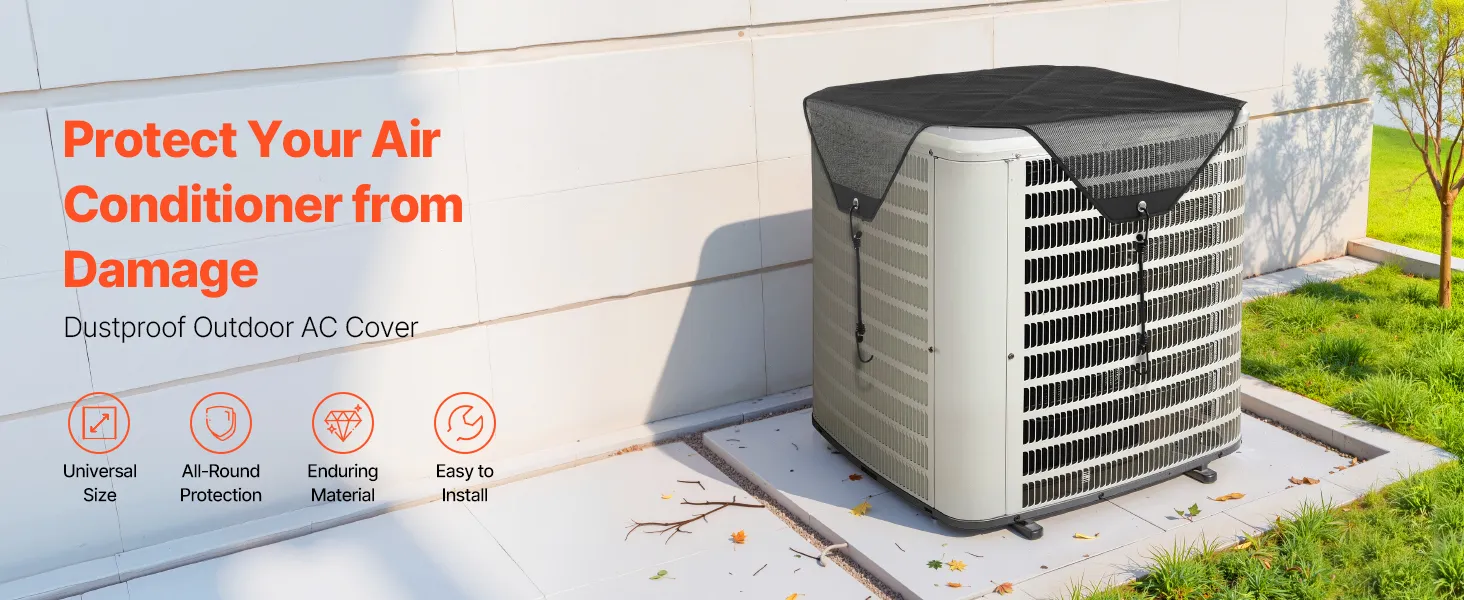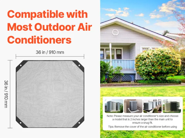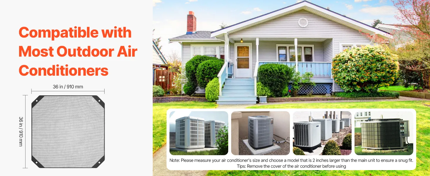Kompatybilny z różnymi klimatyzatorami zewnętrznymi. Aby zapewnić odpowiednie dopasowanie, wybierz model o 5 cm większy od klimatyzatora. Dokładnie zmierz, aby uniknąć problemów z instalacją.