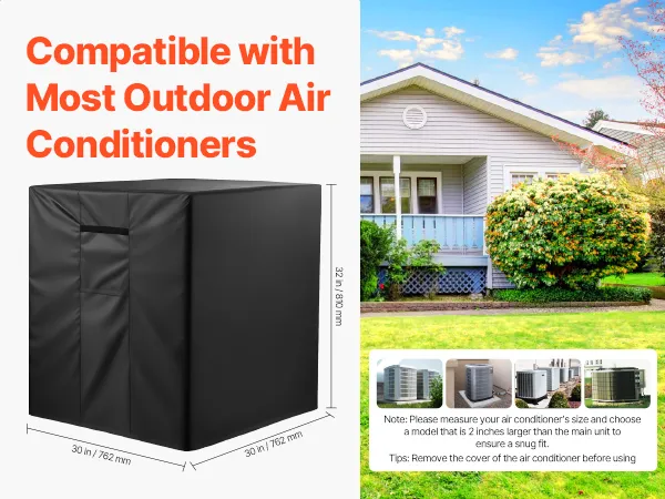 Kompatybilny z różnymi klimatyzatorami zewnętrznymi. Aby zapewnić odpowiednie dopasowanie, wybierz model o 5 cm większy od klimatyzatora. Dokładnie zmierz, aby uniknąć problemów z instalacją.