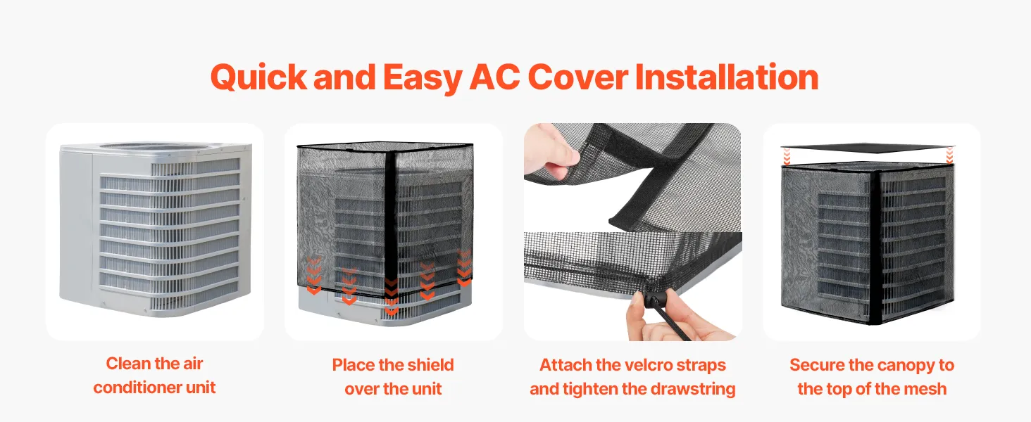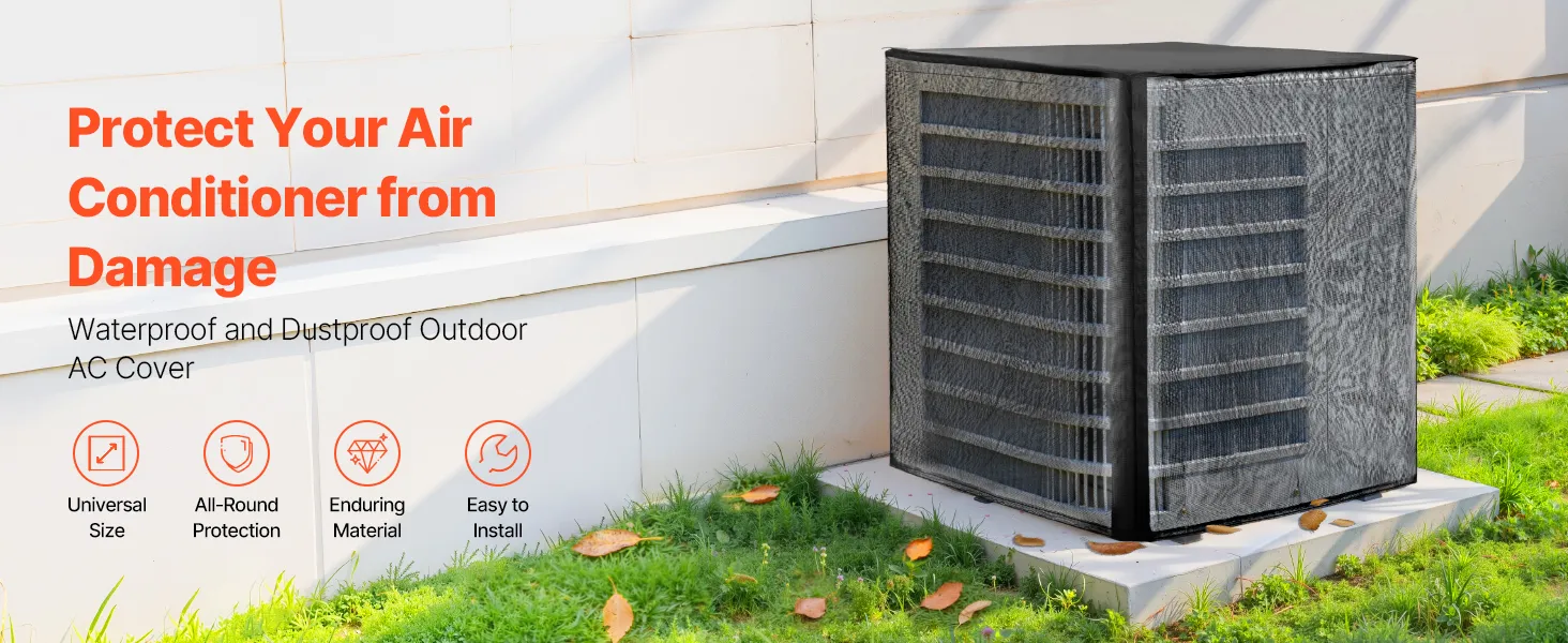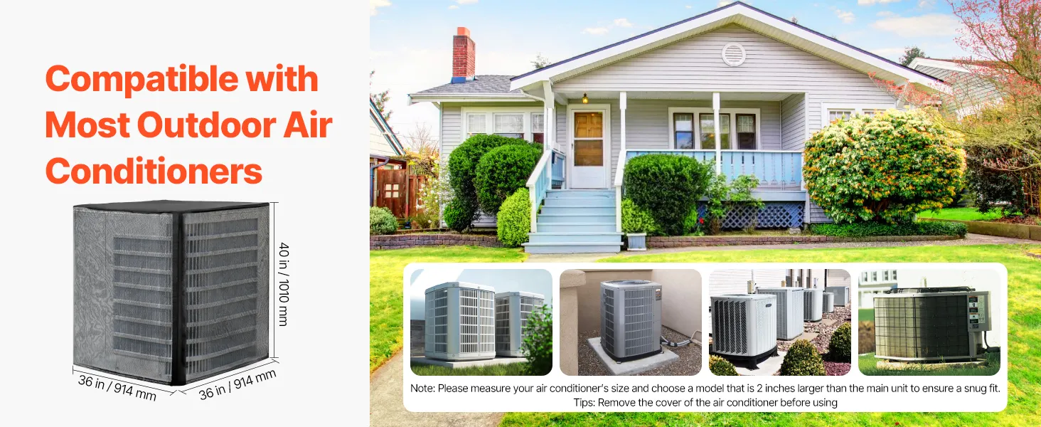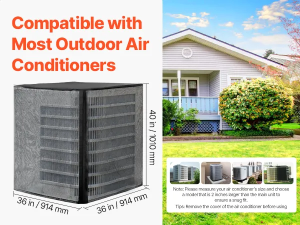Kompatybilny z różnymi klimatyzatorami zewnętrznymi. Aby zapewnić odpowiednie dopasowanie, wybierz model o 5 cm większy od klimatyzatora. Dokładnie zmierz, aby uniknąć problemów z instalacją.
