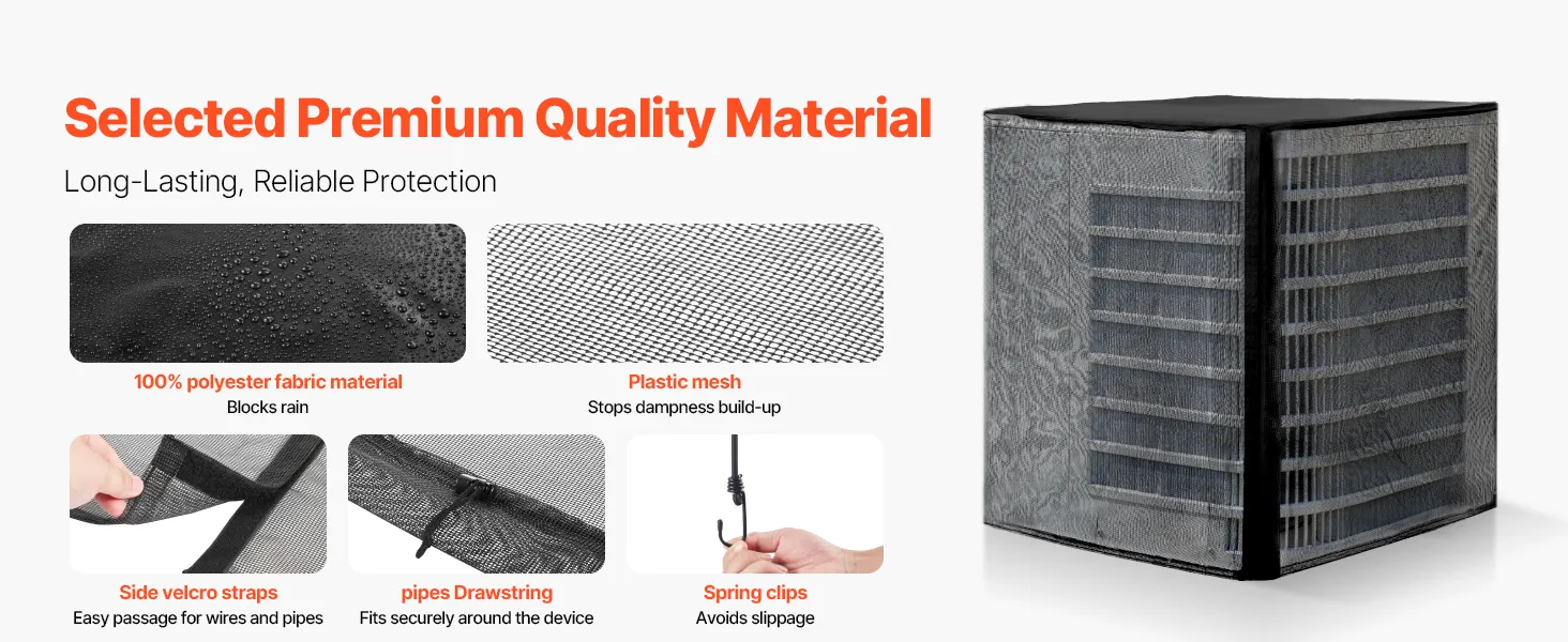 Wysokiej jakości materiał: Ta osłona klimatyzatora posiada zewnętrzną warstwę wykonaną w 100% z wodoodpornego poliestru, chroniącą przed deszczem. Wewnętrzna, oddychająca warstwa z siatki PVC umożliwia cyrkulację powietrza i zapobiega gromadzeniu się wilgoci, zapewniając podwójną ochronę sprzętu w zmiennych warunkach zewnętrznych.