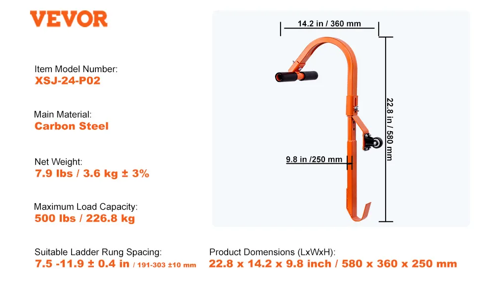 Nasz hak dachowy VEVOR Ladder jest kompatybilny z różnymi typami drabin. Na przykład drewnianymi, z włókna szklanego lub aluminiowymi. Pasuje do odstępów między szczeblami od 7,5'' do 11,9" (0,4"). Wydłużona konstrukcja 22,8" zapewnia dużą trwałość i stabilne podparcie. Dzięki temu nadaje się do szerokiej gamy rozmiarów i typów drabin. Konstrukcja z najwyższej jakości stali gwarantuje długotrwałą wydajność nawet w trudnych warunkach.