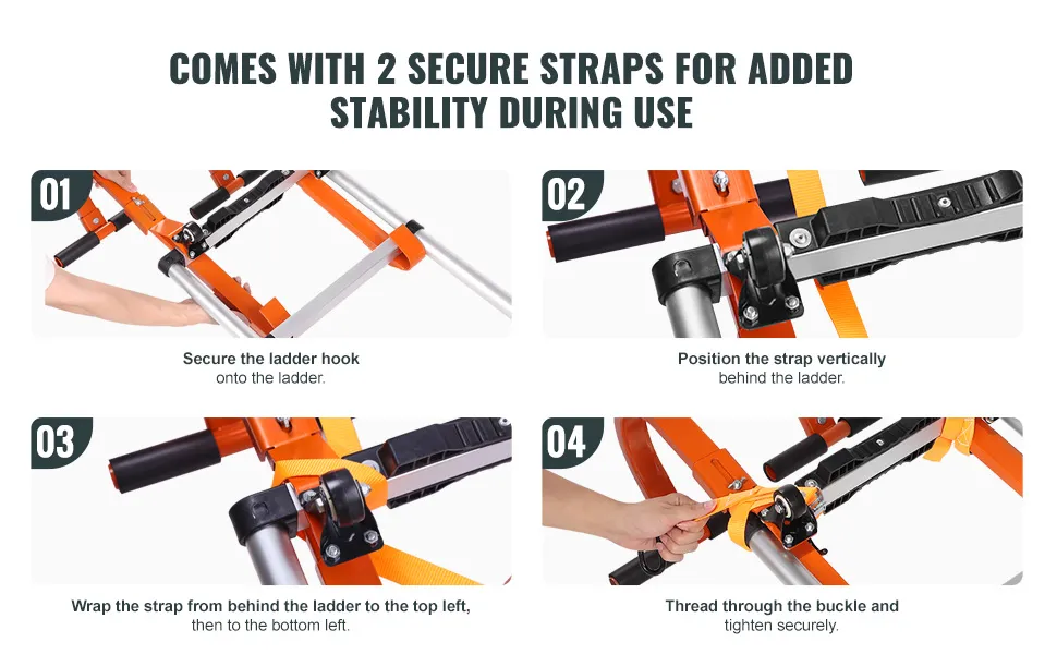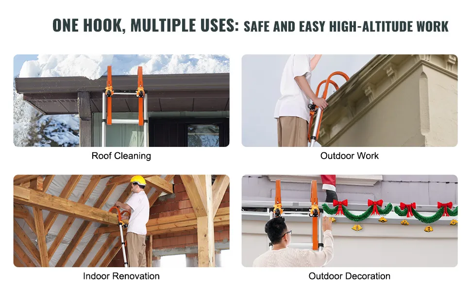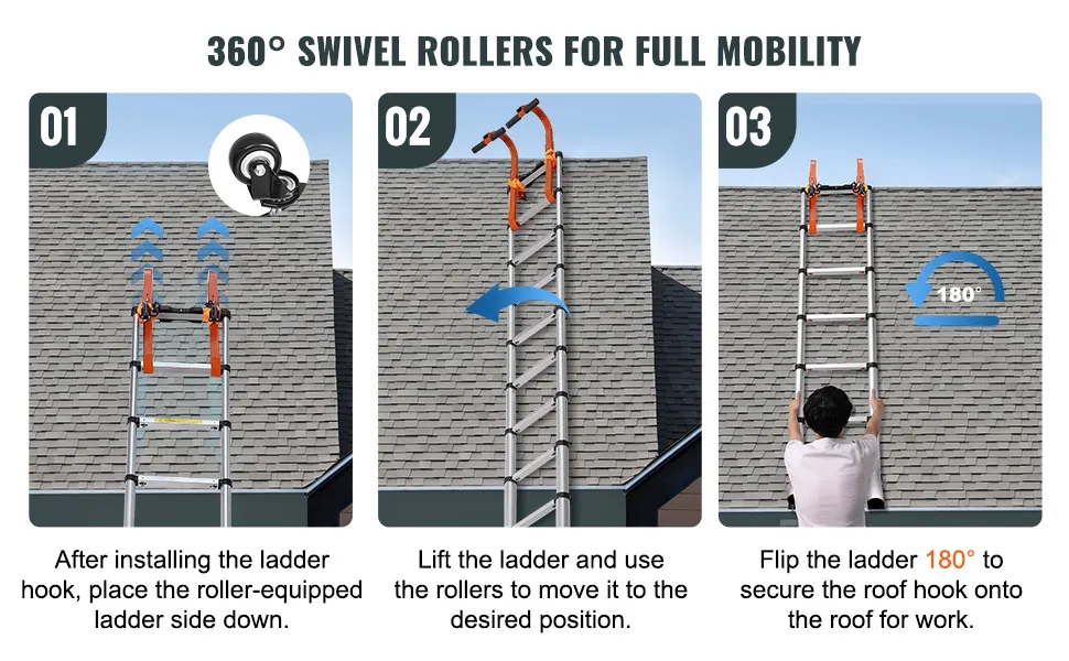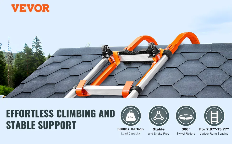 Hak dachowy VEVOR Ladder oferuje łatwą instalację bez skomplikowanych narzędzi ani kroków. Oszczędza czas i wysiłek. Wydajne koła pasowe umożliwiają bezwysiłkowe przesuwanie drabiny, dzięki czemu zadania na dachu są łatwiejsze niż kiedykolwiek. Posiada obrót o 360°, zapewniając łatwą manewrowość i zmniejszając obciążenie podczas ustawiania drabiny na dachach. Zapewnia to bezpieczne połączenie między drabiną a dachem. Zwiększa to wydajność i bezpieczeństwo podczas zadań na dużych wysokościach.