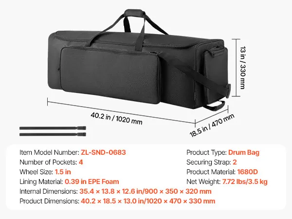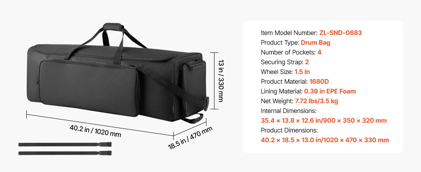 Torba na perkusję VEVOR, torba na sprzęt perkusyjny, 1020x470x330 mm, z regulowanymi paskami na ramię, kółkami i 4 zewnętrznymi kieszeniami, wodoodporna i wyściełana, bezpieczny transport sprzętu i instrumentów