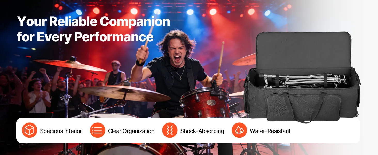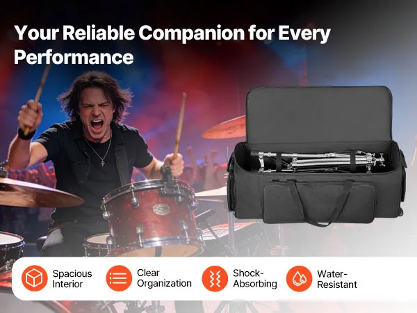 Ta torba na sprzęt perkusyjny z kółkami zachwyca przemyślaną konstrukcją, oferując mnóstwo miejsca do przechowywania i przejrzyście zorganizowane przegródki. Odporna na wstrząsy i wodoodporna, to idealny towarzysz na Twoje koncerty w podróży.