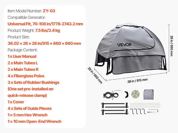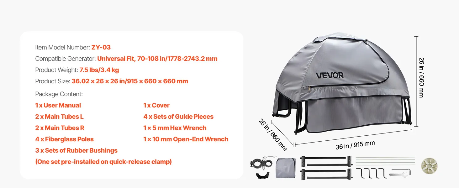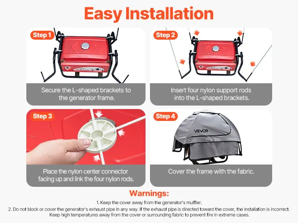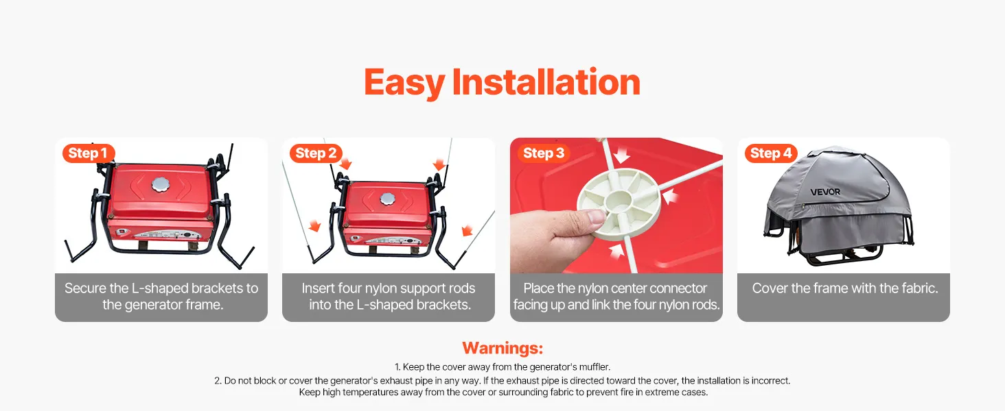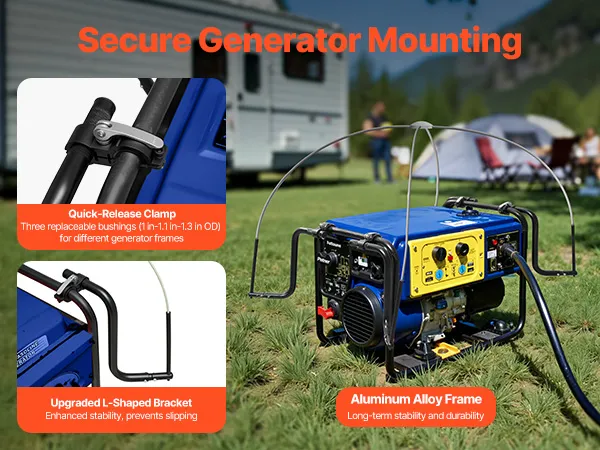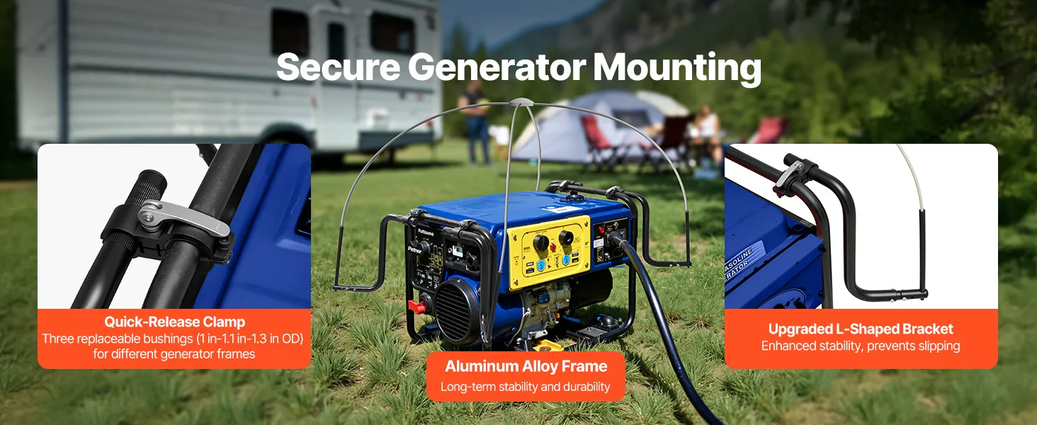 Bezpieczny montaż: Ulepszone wsporniki w kształcie litery L zapobiegają chwianiu się i przesuwaniu, a zagłębione rowki na prętach zapobiegają odbiciu. Nasza wodoodporna osłona generatora jest wyposażona w cztery zapięcia szybkozłączne i trzy tuleje (o średnicy zewnętrznej 1 cala, 1,1 cala i 1,3 cala), dzięki czemu pasuje do większości ram generatorów.