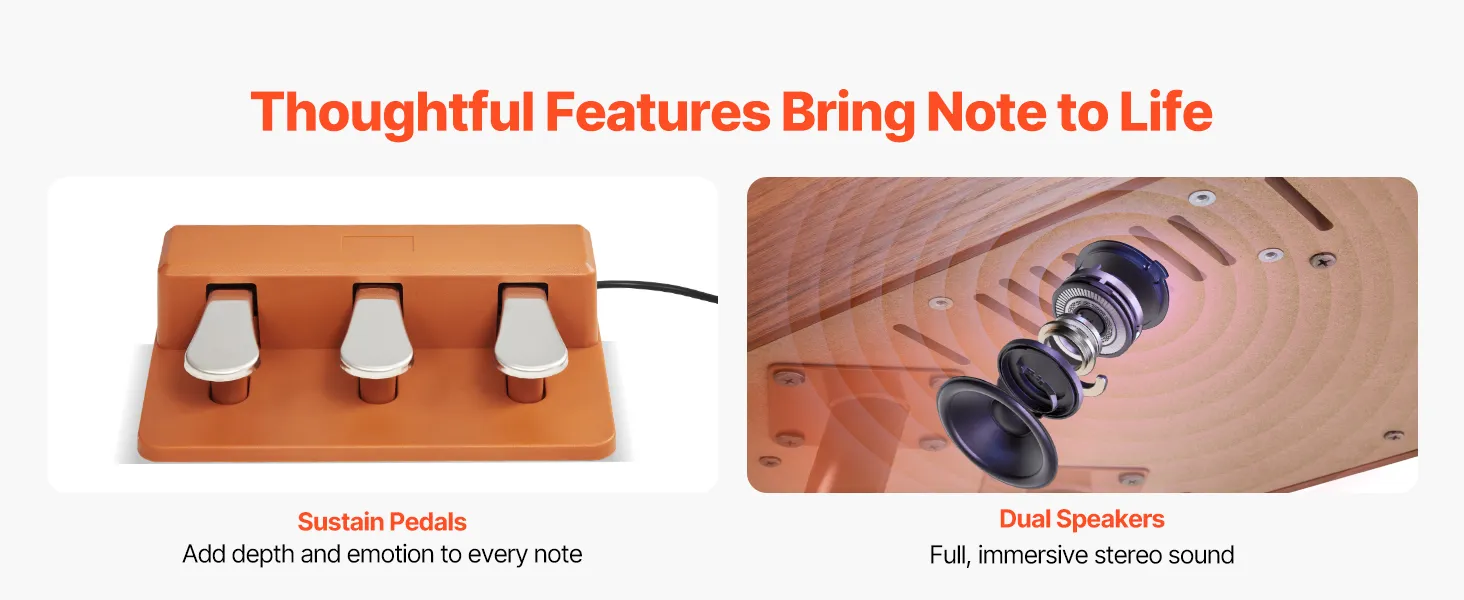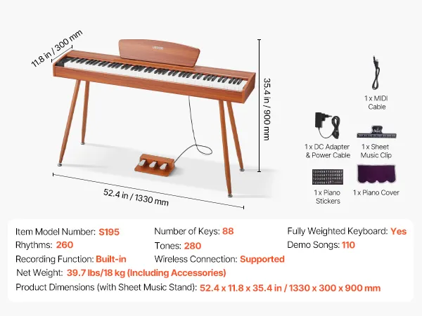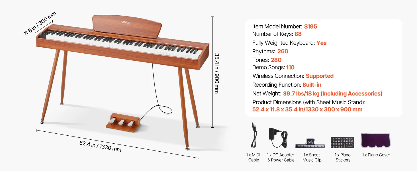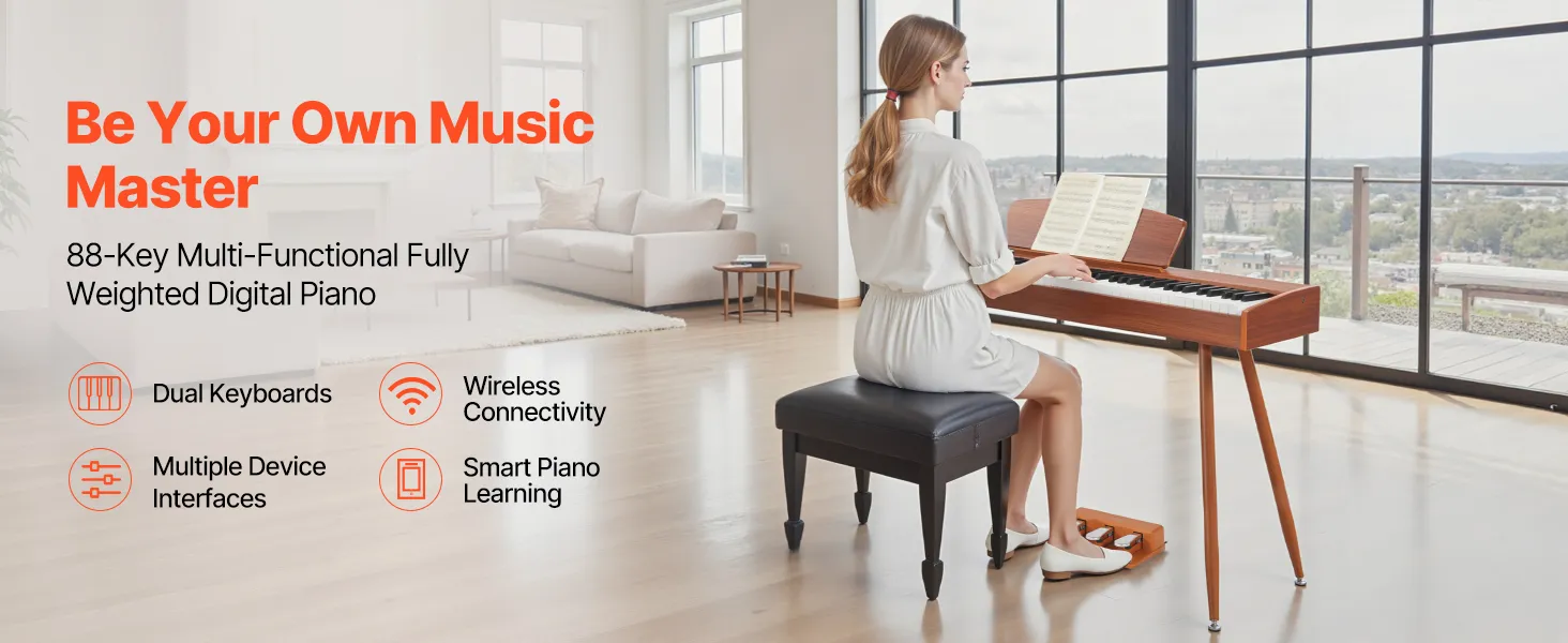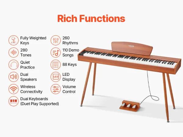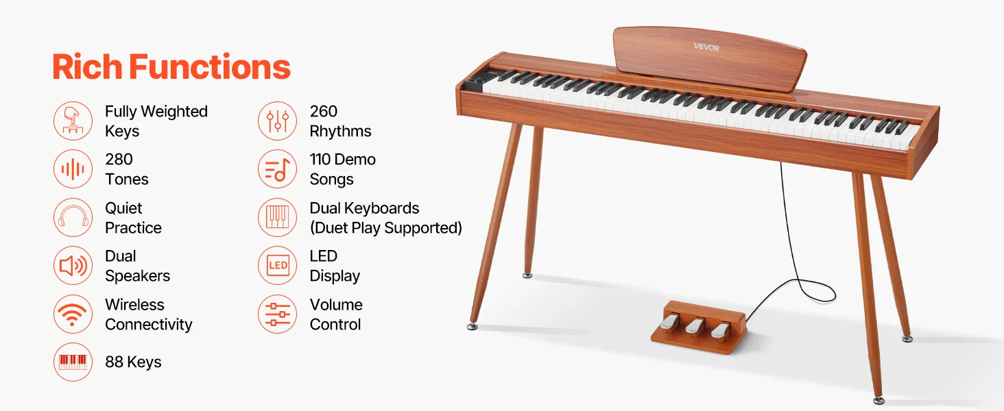 Cyfrowe pianino VEVOR, 88 klawiszy, w pełni ważona, czuła na dotyk klawiatura pianina elektrycznego z pulpitem na nuty, potrójny pedał, zasilacz, 280 nut, obsługuje połączenie bezprzewodowe, dla początkujących, kolor drewna