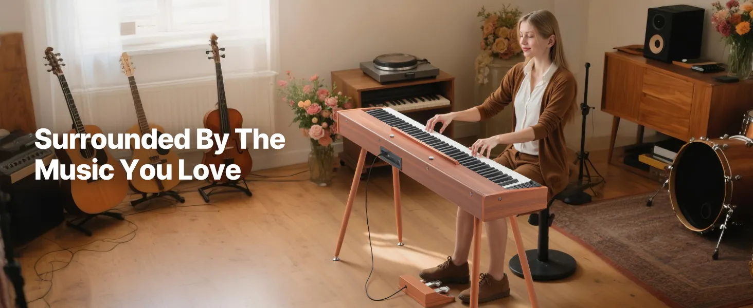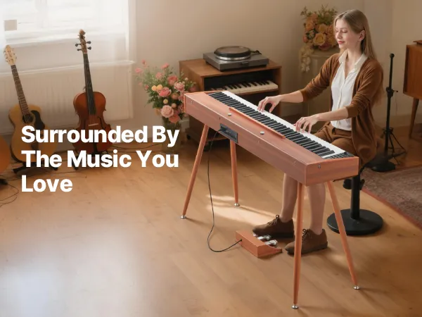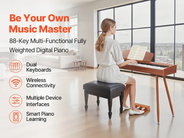 W porównaniu z pianinem akustycznym, nasza 88-klawiszowa, ważona klawiatura jest lżejsza i łatwiejsza w transporcie, dzięki czemu możesz ją ustawić w dowolnym miejscu. Możesz też grać i cieszyć się muzyką razem z przyjaciółmi lub rodziną.