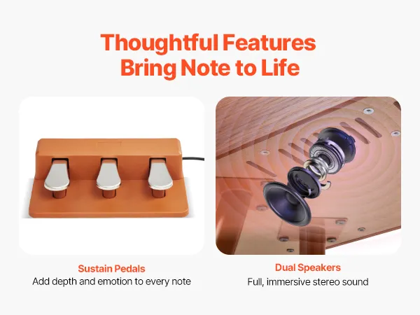 Pedał sustain wydłuża czas trwania nut i umożliwia płynną grę legato. To 88-klawiszowe pianino elektryczne wyposażone jest w dwa głośniki i oferuje bogate brzmienie oraz precyzyjną kontrolę, dostosowaną do potrzeb każdego użytkownika.