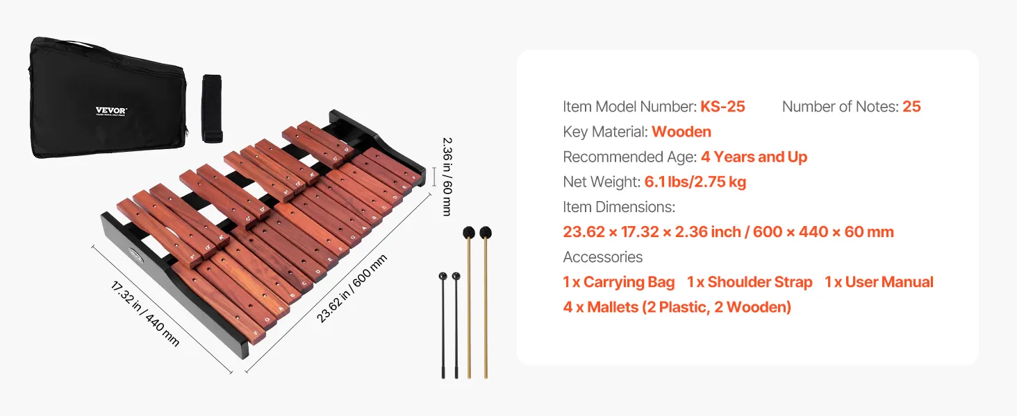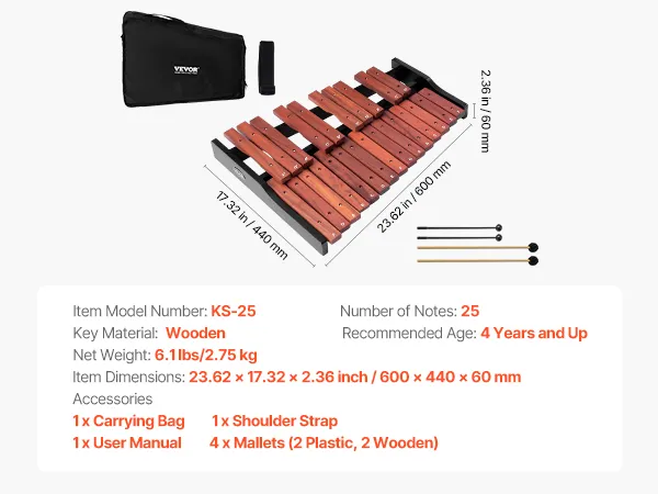 Dzwonki VEVOR, 25 nut, profesjonalny drewniany instrument perkusyjny z ksylofonem i 4 pałeczkami, torba transportowa Oxford 1200D, idealny do nauki muzyki, ćwiczeń i wykonywania piosenek pop