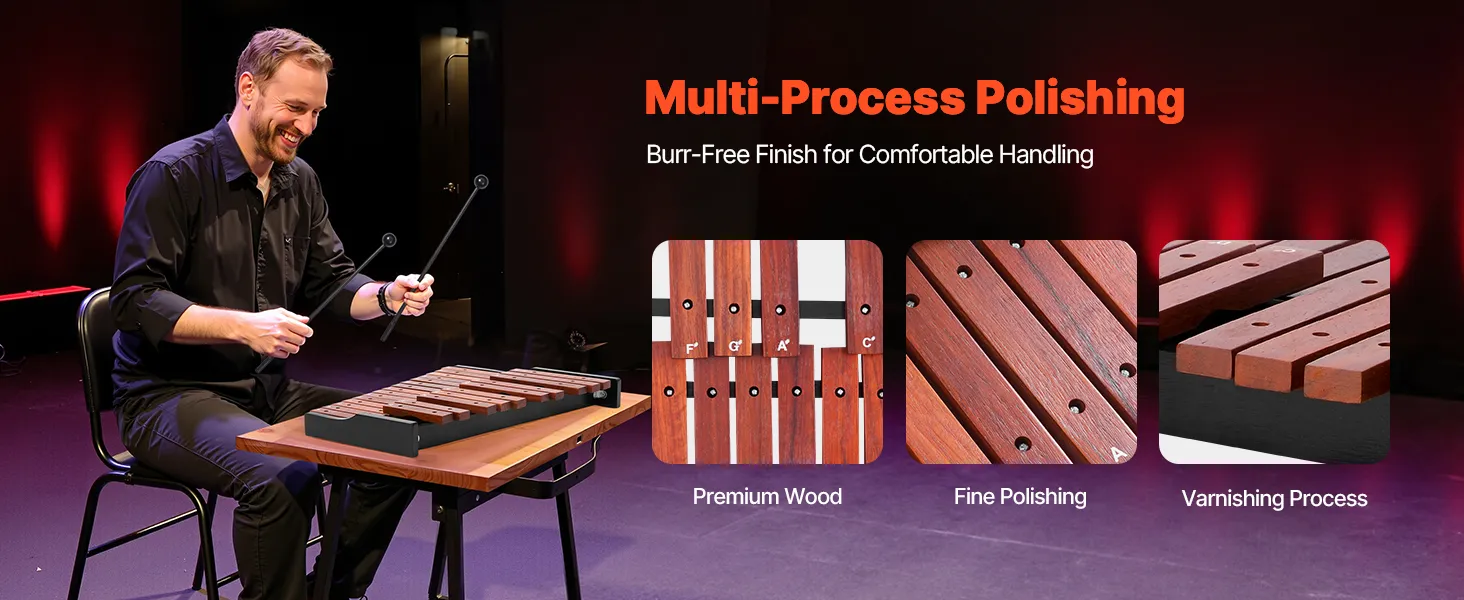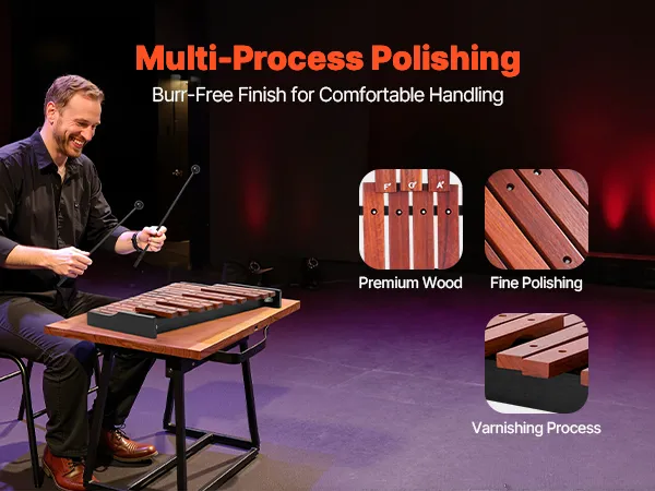 Wykwintne wykonanie: Drewniana rama ksylofonu glockenspiel jest polerowana w kilku etapach szlifowania, a następnie pokryta bezbarwnym lakierem, aby uzyskać gładką, pozbawioną zadziorów powierzchnię. Jest nie tylko bezpieczna w użyciu, ale również atrakcyjna wizualnie i charakteryzuje się wysoką jakością wykonania.