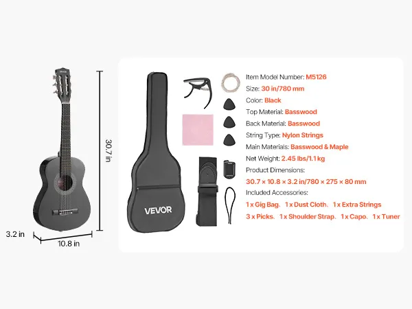 Gitara koncertowa VEVOR, 780 mm, drewniany zestaw startowy do gitary klasycznej dla początkujących, ze strunami nylonowymi, pokrowcem, paskiem, tunerem, dodatkowymi strunami, kostkami, kapodastrem, drewno lipowe, dla początkujących, kolor czarny