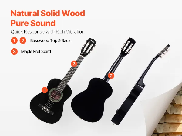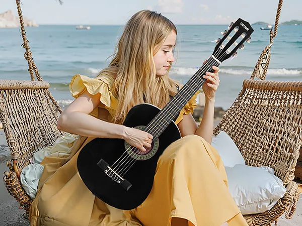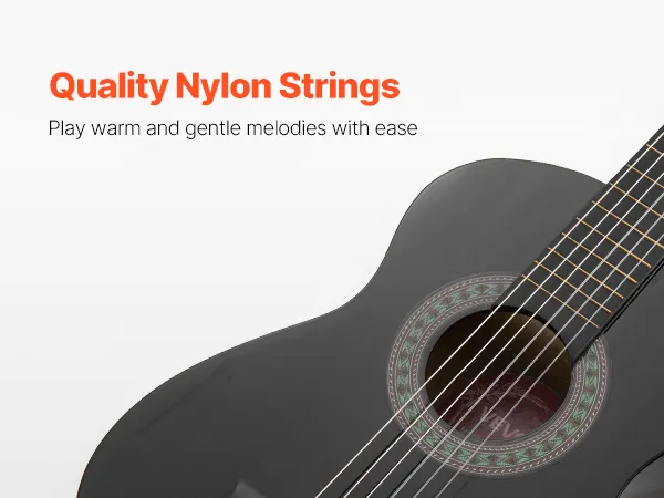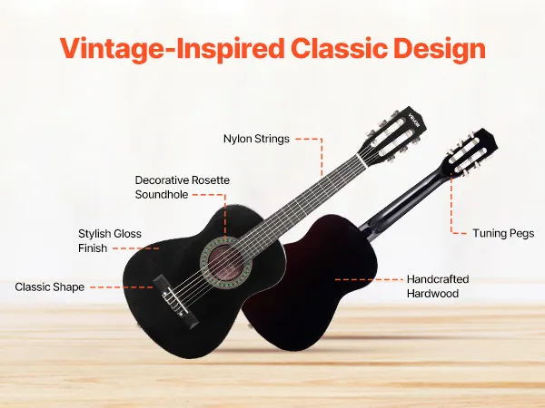 Klasyczny, retro design: Ta klasyczna, drewniana gitara zachwyca pięknie wykonanym wykończeniem i ciasnym wiązaniem, co zapewnia dodatkową trwałość i odporność na wstrząsy. Dzięki wąskiemu odstępowi między strunami a progami, gitara ta jest odpowiednia dla początkujących i zmniejsza zmęczenie palców podczas gry.