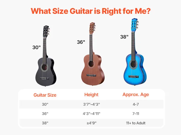 P: Czy ta gitara jest odpowiednia dla dorosłych czy dla dzieci? A: Oferujemy gitary klasyczne w rozmiarach 30", 36" i 38" dla graczy w każdym wieku: 38" pełny rozmiar: dla dorosłych i nastolatków o wzroście od 160 cm. Rozmiar 36": dla dzieci w wieku 7-11 lat, 4'3"-4'11". Rozmiar 30": dla młodszych dzieci w wieku 4-7 lat, 3'7"-4'3".