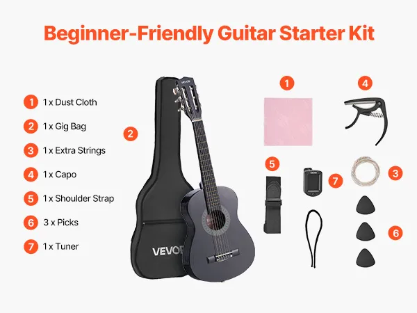 Kompletny zestaw startowy: Ten drewniany zestaw gitarowy zawiera wszystko, czego potrzebujesz, aby od razu zacząć grać: 1 x pokrowiec, 1 x ściereczka do kurzu, 1 x zapasowa struna, 3 x kostki, 1 x pasek na ramię, 1 x tuner i 1 x kapodaster. Nie wymaga dodatkowych zakupów.