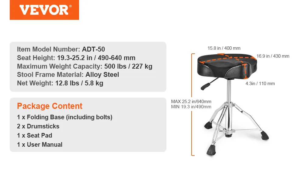 Hydrauliczny tron bębnowy VEVOR zapewnia płynną regulację wysokości. Hydrauliczny pręt zapewnia stabilną i łatwą regulację. Ta funkcja jest lepsza od tradycyjnych obrotowych tronów bębnowych, takich jak VEVOR lub TNT. Możesz ustawić żądaną wysokość siedziska, po prostu regulując dźwignię. Wysokość siedziska mieści się w zakresie od 19,3 do 25,2 cala. Jest odpowiedni dla perkusistów o każdym wzroście. Nasz system hydrauliczny jest niezawodny i trwały, dzięki czemu za każdym razem masz niezawodne doświadczenie. Ciesz się wygodą i wydajnością tego hydraulicznego tronu bębnowego.