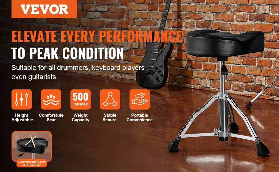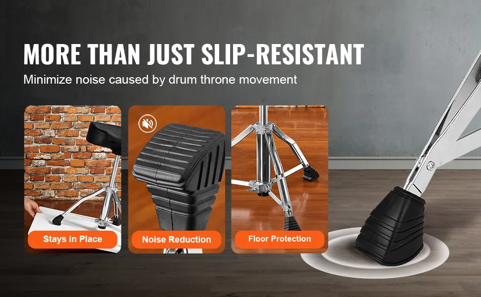Wyściełane siedzisko perkusyjne VEVOR ma mocny, dwustronny i antypoślizgowy trójnóg. Solidna trójkątna rama stalowa zapewnia stabilność i może utrzymać ciężar do 500 funtów. Duże gumowe nóżki mocno trzymają się podłogi. Zapobiega to wszelkim ruchom lub poślizgom podczas gry. Chroni również podłogę przed zarysowaniami. Konstrukcja gwarantuje, że pozostaniesz uziemiony i bezpieczny. Ta stabilność jest ważna dla perkusistów, którzy potrzebują niezawodnego fundamentu. Zaufaj wytrzymałości i niezawodności tego tronu perkusyjnego.