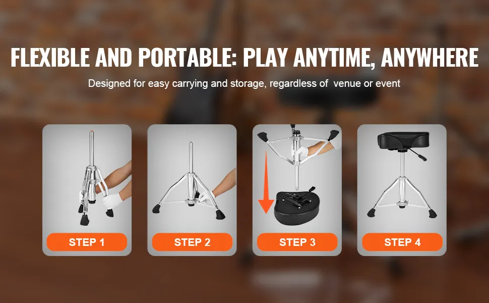 Stołek perkusyjny VEVOR jest idealny dla perkusistów i muzyków. Zapewnia komfort i trwałość, których potrzebujesz. Grube wypełnienie i szerokie siedzisko zapewniają długotrwały komfort. Wytrzymała rama w połączeniu z antypoślizgowymi nóżkami zapewniają niezachwianą stabilność. Hydrauliczny system regulacji wysokości ułatwia użytkowanie. Składana konstrukcja i lekka konstrukcja zwiększają przenośność. Obrót o 360° zwiększa jego wszechstronność, dzięki czemu ten stołek perkusyjny z antypoślizgowymi nóżkami jest niezawodnym wyborem dla każdego muzyka. Zainwestuj w siedzisko, które wspiera Twoje występy i dobre samopoczucie.