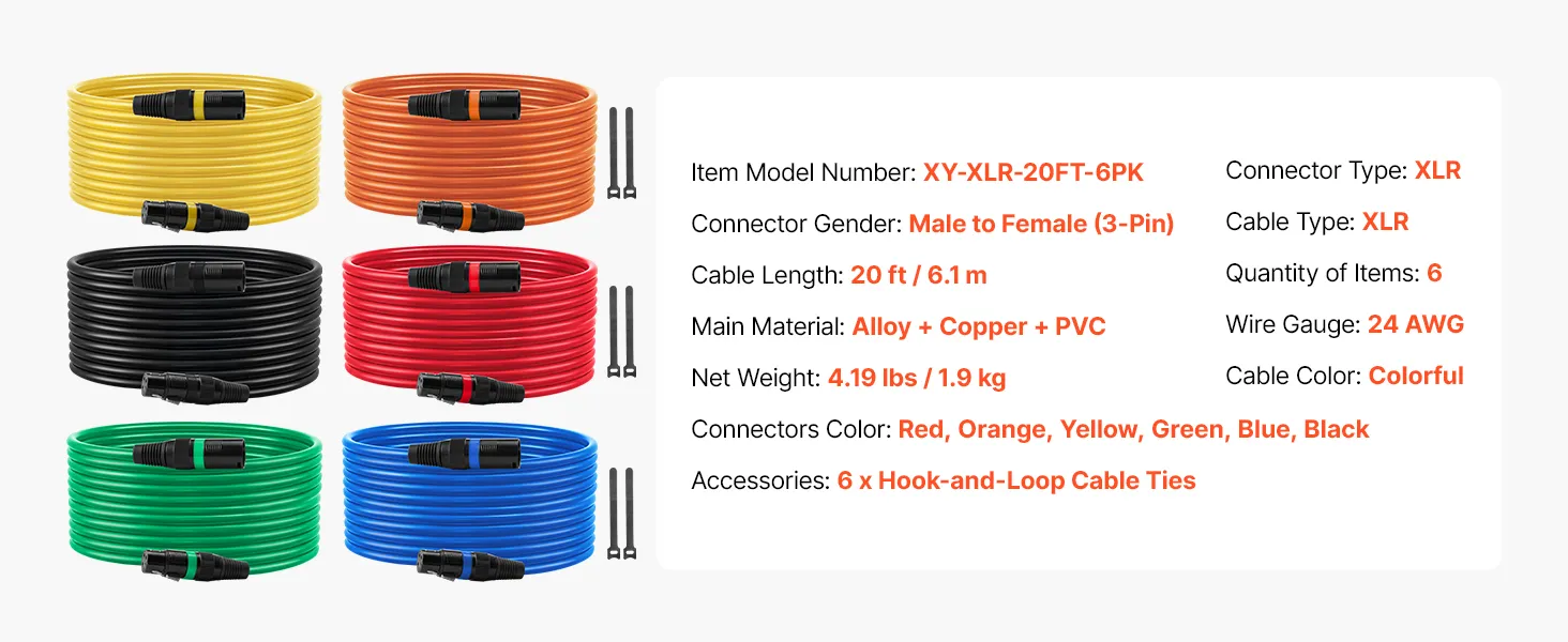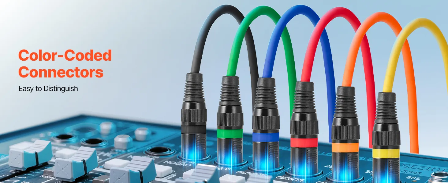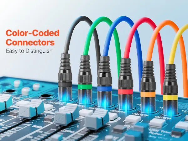 • Elastyczny kabel PVC: Nasz kabel mikrofonowy jest wykonany z elastycznego materiału PVC, który jest odporny na zużycie, łatwy w czyszczeniu i łatwy do uporządkowania, co zapobiega plątaniu się podczas użytkowania. Każdy kabel XLR ma złącze oznaczone innym kolorem, co ułatwia identyfikację.