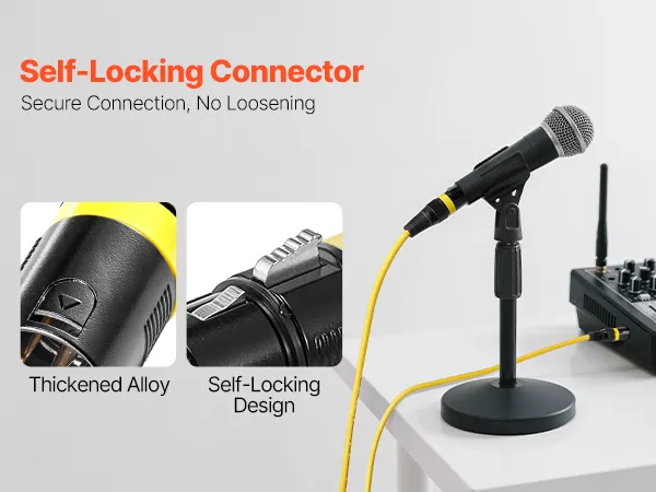 Złącze XLR kabla mikrofonowego wykonane z litego stopu charakteryzuje się samoblokującą konstrukcją. Automatycznie blokuje się po włożeniu, zapewniając stabilne połączenie bez luzowania i oferując wygodę podłączania i używania.