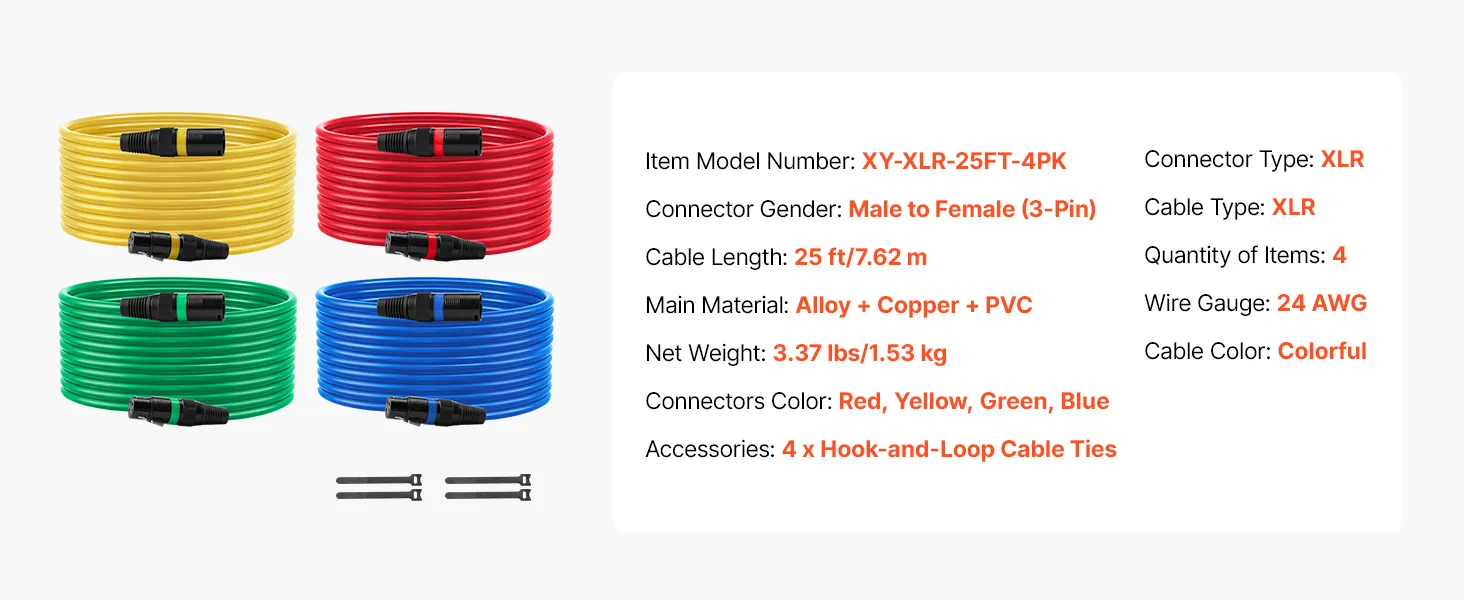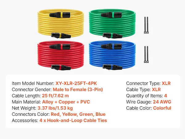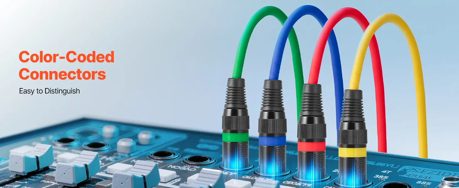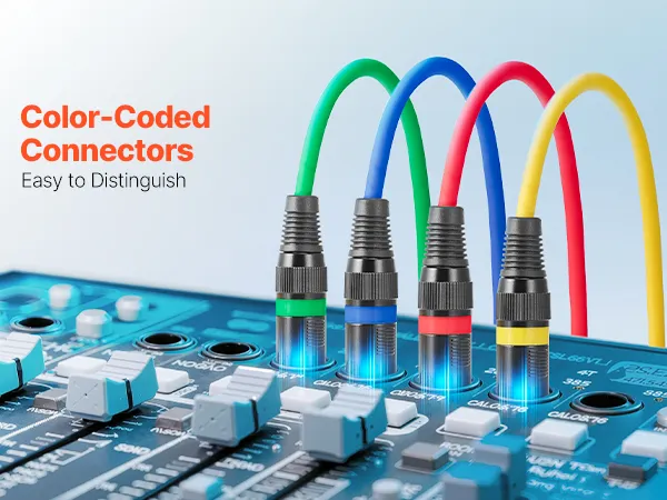 • Elastyczny kabel PVC: Nasz kabel mikrofonowy jest wykonany z elastycznego materiału PVC, który jest odporny na zużycie, łatwy w czyszczeniu i łatwy do uporządkowania, co zapobiega plątaniu się podczas użytkowania. Każdy kabel XLR ma złącze oznaczone innym kolorem, co ułatwia identyfikację.