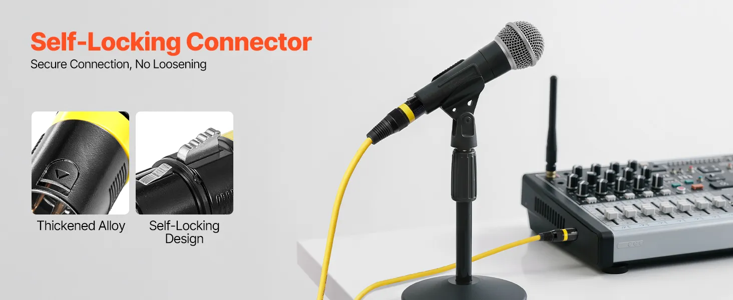 Złącze XLR kabla mikrofonowego wykonane z litego stopu charakteryzuje się samoblokującą konstrukcją. Automatycznie blokuje się po włożeniu, zapewniając stabilne połączenie bez luzowania i oferując wygodę podłączania i używania.
