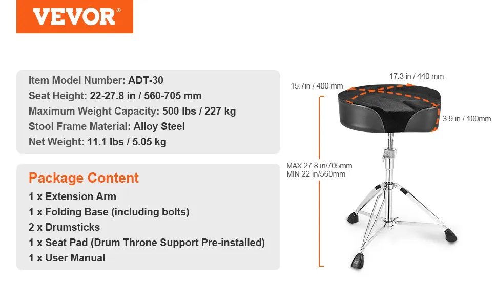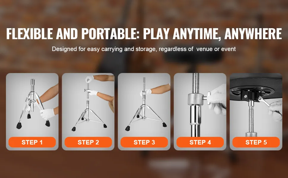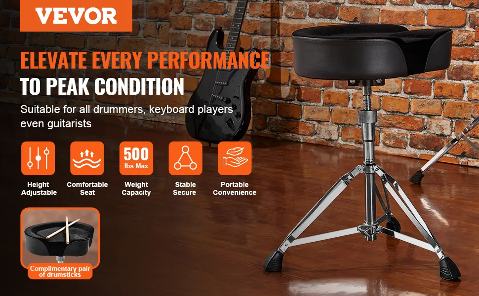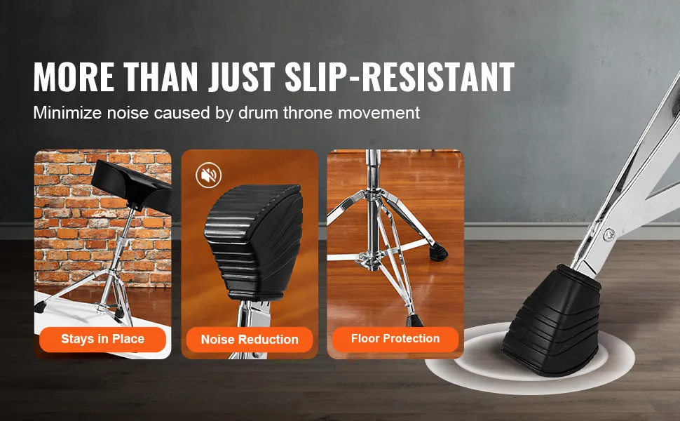 Stabilność jest bardzo ważna dla każdego perkusisty. Tron perkusyjny siodłowy VEVOR ma antypoślizgowe nóżki. Dzięki temu stołek pozostaje na swoim miejscu przez cały występ. Właściwości antypoślizgowe zapewniają solidną podstawę. Możesz grać pewnie, wiedząc, że tron się nie ześlizgnie ani nie przesunie. Jest to szczególnie ważne podczas energicznych występów. Antypoślizgowe nóżki chronią również podłogę. Zapobiegają powstawaniu zarysowań i uszkodzeń. Ponadto możesz skupić się na grze. Dlatego jest to doskonały wybór zarówno do ćwiczeń w domu, jak i występów na żywo.