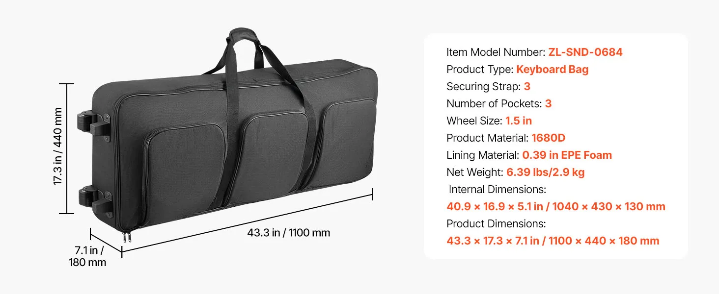 Torba na klawiaturę VEVOR, torba na klawiaturę 88 klawiszy, 1100 x 440 x 180 mm, torba na pianino elektryczne z regulowanymi paskami na ramię, uchwytami do przenoszenia i kółkami, 1680D, wodoodporna i wyściełana do klawiatury