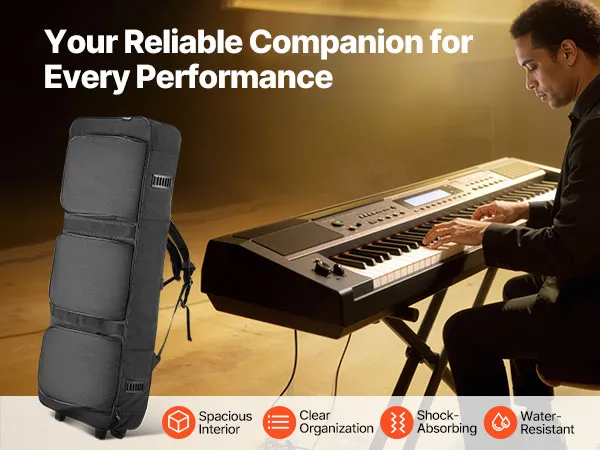 Wszechstronne możliwości noszenia: Nasza torba na 88-klawiszowy keyboard oferuje muzykom i podróżnikom trzy opcje noszenia. Kółka u dołu ułatwiają przesuwanie, rączka idealnie nadaje się do szybkiego transportu, a konstrukcja plecaka pozwala na noszenie bez użycia rąk.