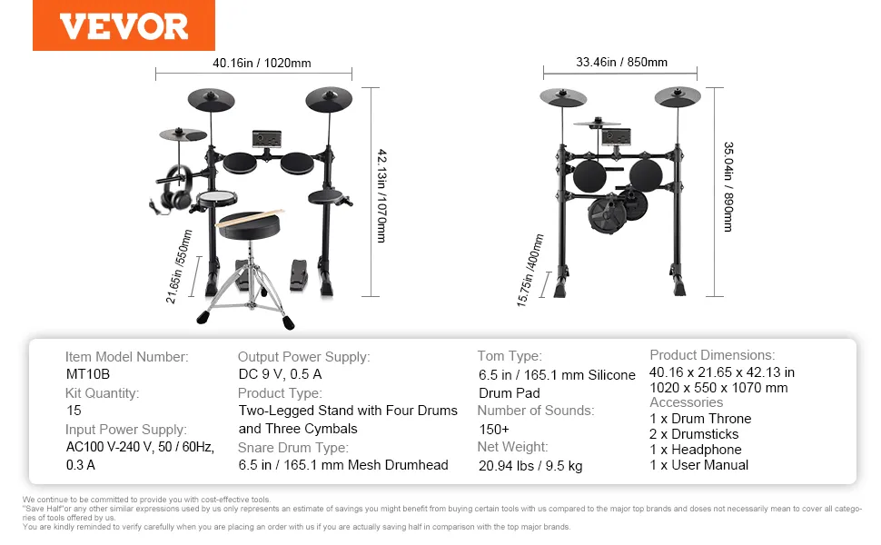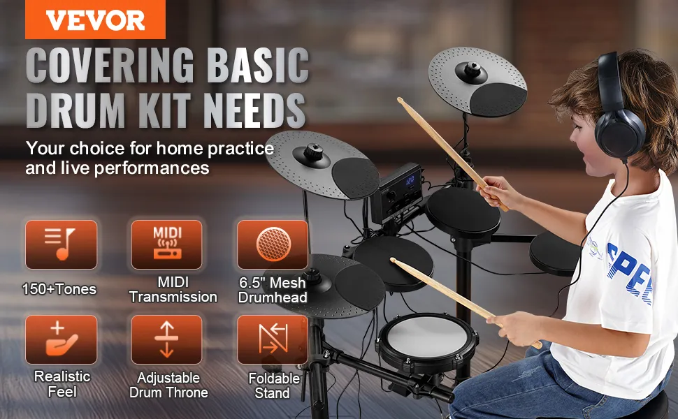 Zestaw perkusyjny VEVOR, 15 zestawów perkusyjnych i 150 dźwięków, elektroniczny zestaw perkusyjny, obsługa USB MIDI, werbel siatkowy 165,1 mm, talerz 25,4 cm, pałeczki perkusyjne i słuchawki, dla początkujących i dorosłych