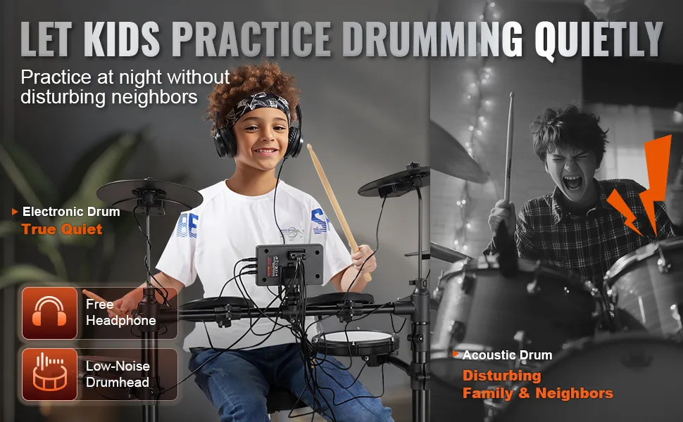 Kompletny zestaw perkusyjny: Ten elektroniczny zestaw perkusyjny zawiera cztery bębny o średnicy 6,5 cala (165,1 mm) i trzy talerze perkusyjne o średnicy 10 cali (25,4 cm), co zapewnia pełną powierzchnię perkusyjną. W zestawie znajduje się moduł perkusyjny, pałeczki i pedały, a także słuchawki i regulowane siedzisko. Idealny dla początkujących i osób trenujących rytm!