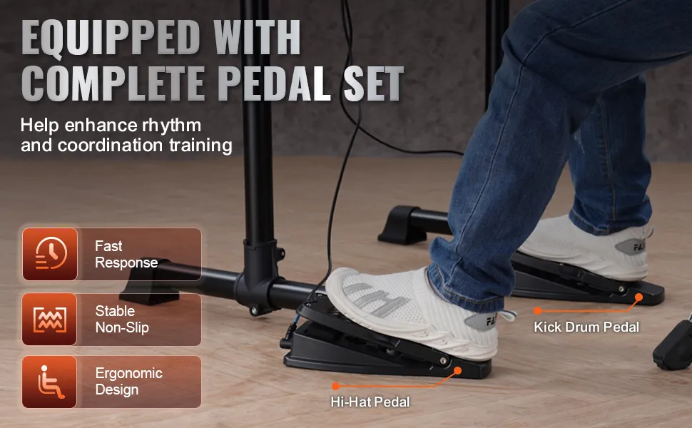 Pedały hi-hatu i stopy zostały zaprojektowane z myślą o szybkiej reakcji i pewnym chwycie, gwarantując stabilność podczas gry. Ciesz się komfortem podczas długich sesji treningowych dzięki naszej ergonomicznej konstrukcji.
