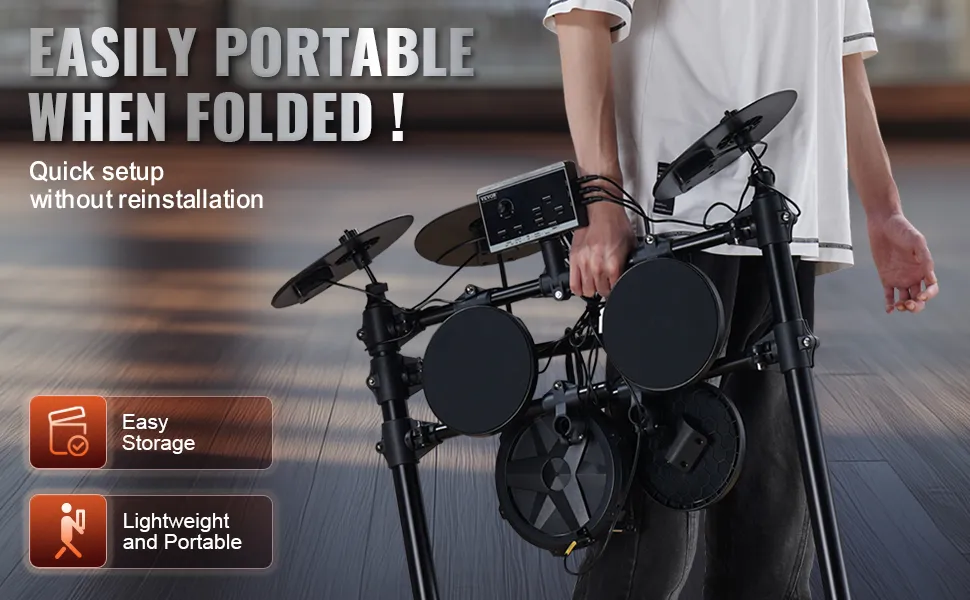 Ten elektroniczny zestaw perkusyjny składa się szybko, co ułatwia konfigurację w domu, w studiu lub na scenie – nie wymaga ponownego montażu! Oszczędź czas i zacznij grać na perkusji od razu, gdziekolwiek jesteś.