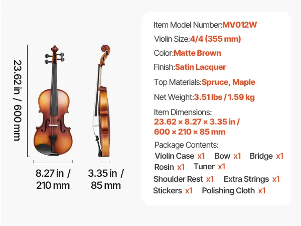 Skrzypce 4/4: Ten rozmiar skrzypiec jest idealny dla użytkowników w wieku 12 lat i starszych, z długością ramienia 584,2 mm. To idealny instrument skrzypcowy dla początkujących i wykonawców, idealny na lekcje, występy lub ćwiczenia w domu.