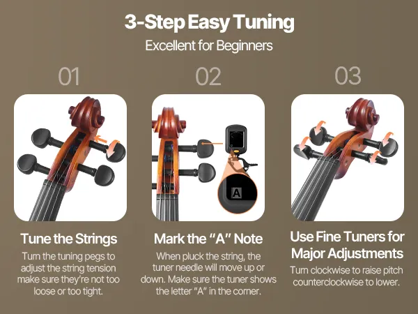 Łatwe strojenie: Do skrzypiec dołączony jest tuner, który zapewnia precyzyjne wykrywanie wysokości dźwięku, co gwarantuje uzyskanie idealnej wysokości dźwięku za każdym razem. Niezależnie od tego, czy jesteś początkującym, czy profesjonalistą, bez wysiłku opanujesz techniki strojenia i ulepszysz swoje wrażenia z gry.
