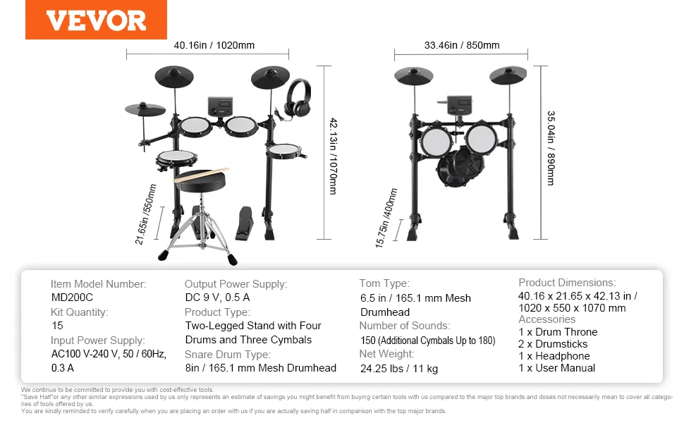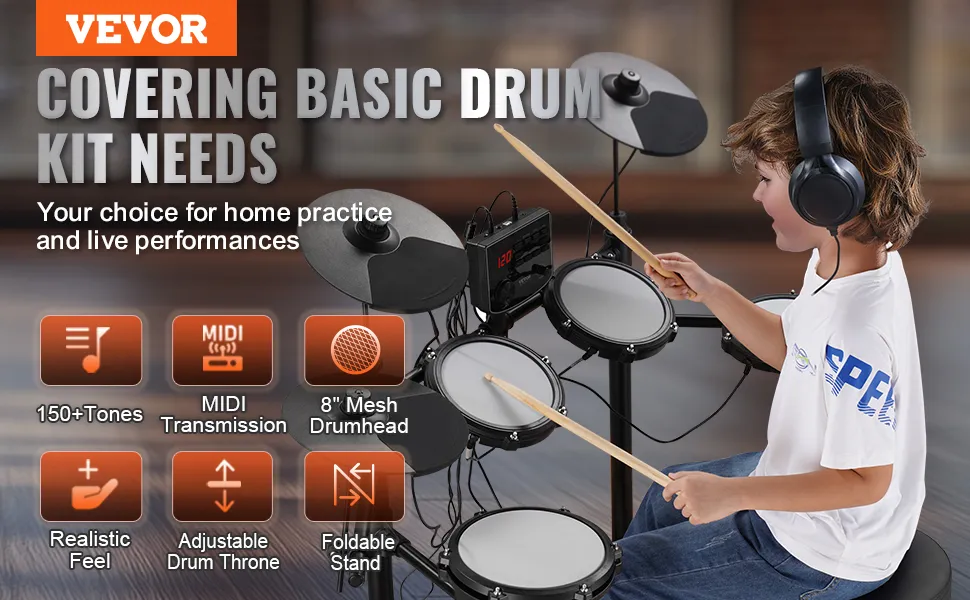 Elektroniczny zestaw perkusyjny VEVOR, 15 zestawów perkusyjnych i 150 brzmień, elektroniczny zestaw perkusyjny z obsługą USB MIDI, cichym 8-calowym werblem siateczkowym, talerzem 10-calowym, pałeczkami i słuchawkami, dla początkujących i dorosłych