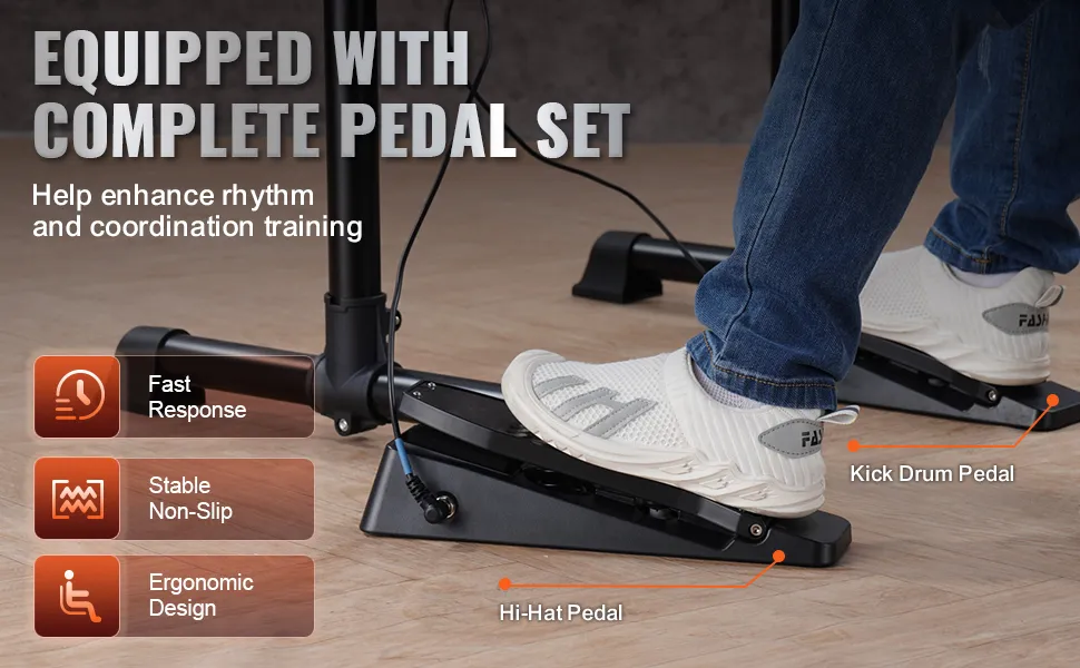 Pedały hi-hatu i stopy zostały zaprojektowane z myślą o szybkiej reakcji i pewnym chwycie, gwarantując stabilność podczas gry. Ciesz się komfortem podczas długich sesji treningowych dzięki naszej ergonomicznej konstrukcji.