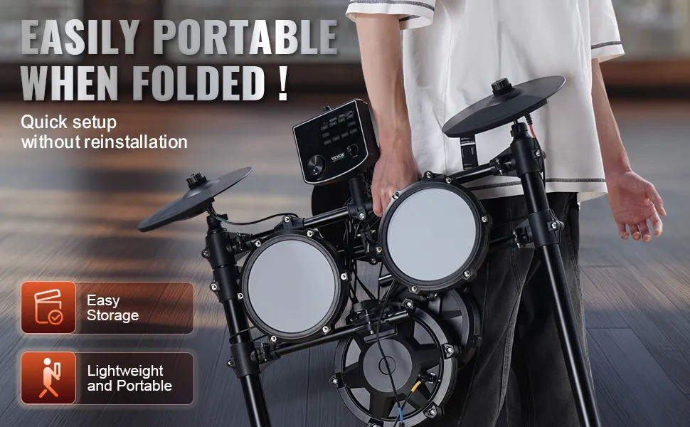 Ten elektroniczny zestaw perkusyjny składa się szybko, co ułatwia konfigurację w domu, w studiu lub na scenie – nie wymaga ponownego montażu! Oszczędź czas i zacznij grać od razu, niezależnie od tego, gdzie jesteś.