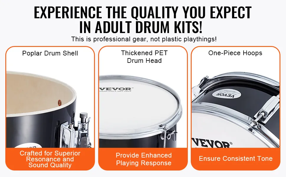 To świetna wartość za tę cenę. Zawiera wszystkie niezbędne części perkusyjne zawarte w zestawie. Jakość jest niezwykła, zwłaszcza biorąc pod uwagę cenę. Te bębny są wykonane z drewna topolowego, które jest znane ze swojej trwałość. Talerze i pedały są wykonane ze stali węglowej, co zapewnia długowieczność. Materiały i konstrukcja tego zestawu nadają się do regularnego użytku. Są niedrogim sposobem na wprowadzenie dzieci w świat muzyki. Powinieneś wziąć pod uwagę jakość tego zestawu, szczególnie jeśli masz ograniczony budżet lub ktoś z rodziny interesuje się muzyką.