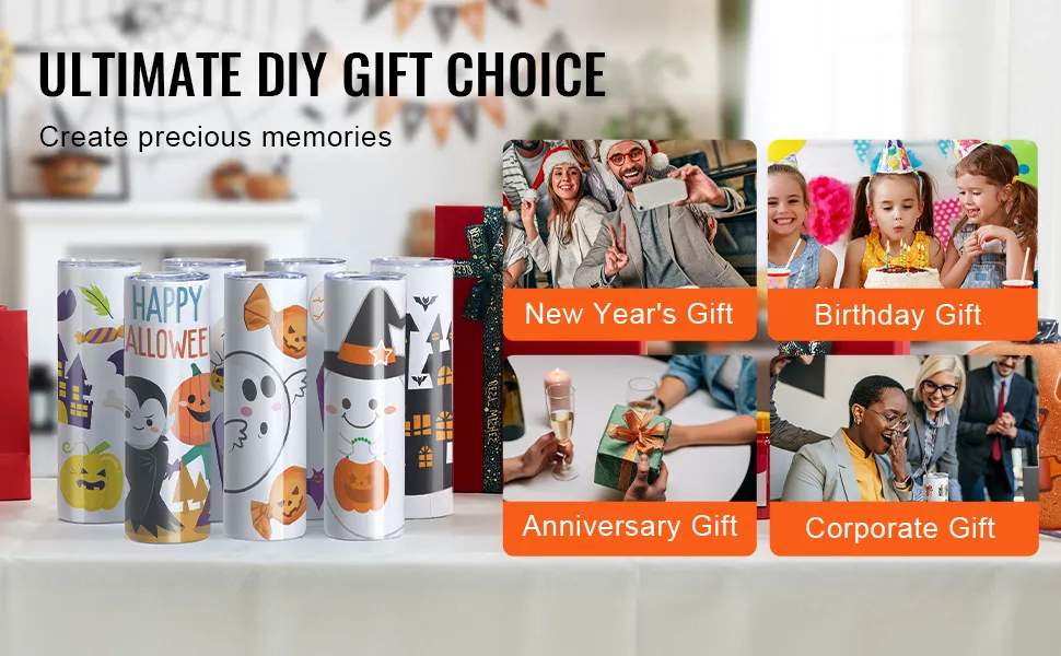 Kubki ze stali nierdzewnej VEVOR mają białą powłokę sublimacyjną, dzięki czemu łatwo przenieść wzory. Kubki są dostarczane z folią termokurczliwą. Proces personalizacji jest tak prosty i przyjemny. Możesz wydrukować swój wzór na folii termokurczliwej, nałożyć folię na kubek i podgrzać, aby przenieść wzór na kubek. Tworzy to trwały i żywy proces drukowania. Ten szybki proces wymaga minimalnego wysiłku i jest idealny dla początkujących i doświadczonych użytkowników. Powłoka sublimacyjna zapewnia, że wzory są jaskrawo wyraźne, dzięki czemu możesz używać tych kubków do spersonalizowanych prezentów.
