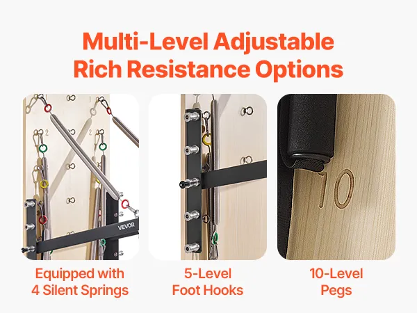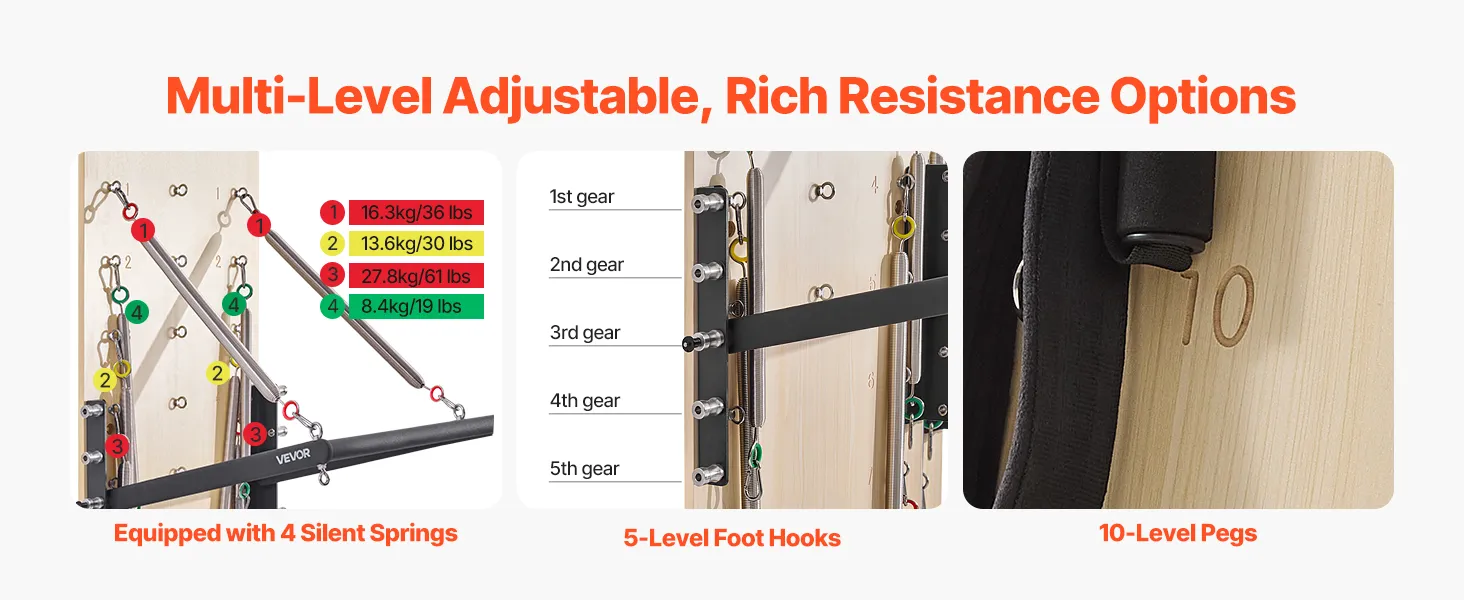 Regulowany poziom oporu: montowany na ścianie reformer do ćwiczeń Pilatesa wykorzystuje wysokiej jakości sprężyny, które zapewniają solidną i stabilną konstrukcję. Posiada 8 regulowanych poziomów, zawiera mieszankę mocnych, średnich i lekkich sprężyn i posiada 5 regulowanych zaczepów na stopy oraz 10 regulowanych kołków na desce, które umożliwiają dostosowane treningi