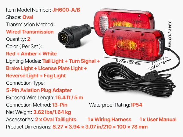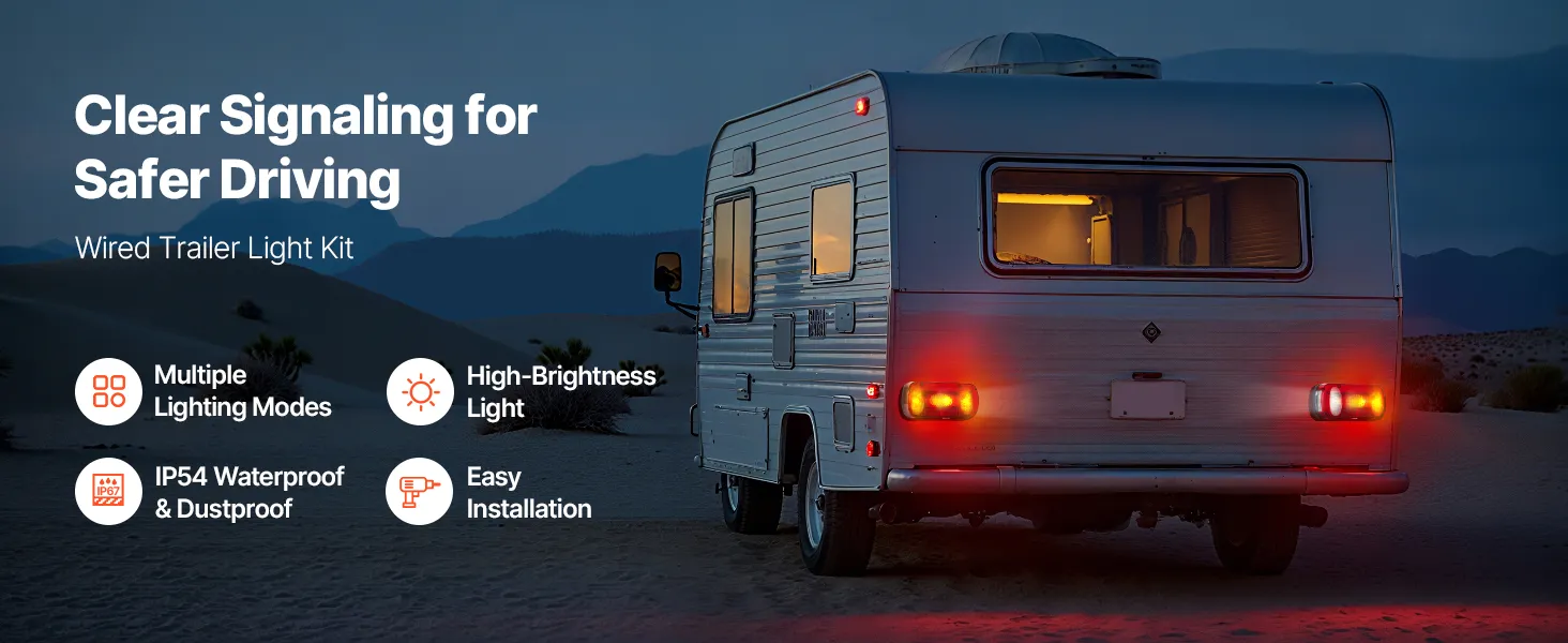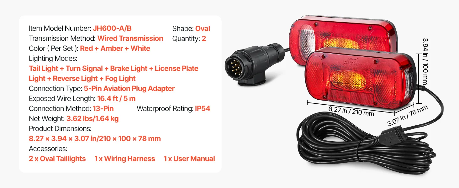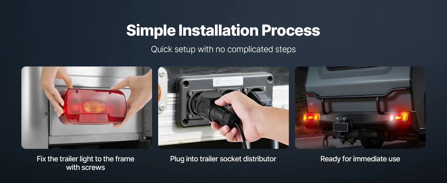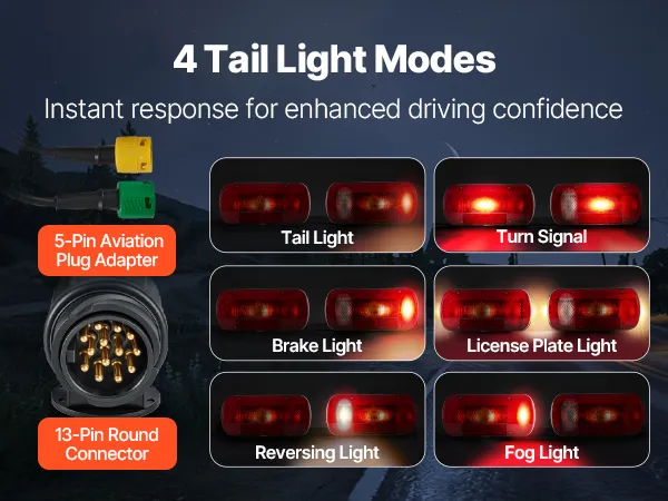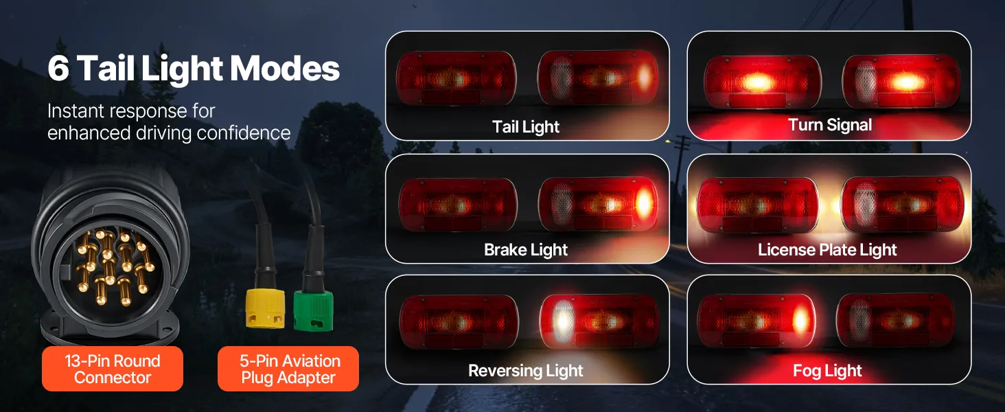 Wielofunkcyjny zestaw oświetlenia przyczepy: Oświetlenie przyczepy oferuje 6 trybów pracy (kierunkowskazy, światło tylne, światło hamowania, oświetlenie tablicy rejestracyjnej, światło cofania i światło przeciwmgielne), umożliwiając wyraźną sygnalizację w każdych warunkach drogowych. Jest zgodne z przepisami ruchu drogowego i spełnia wszystkie wymogi bezpieczeństwa.
