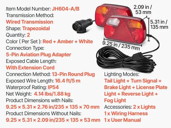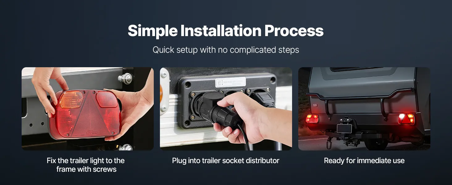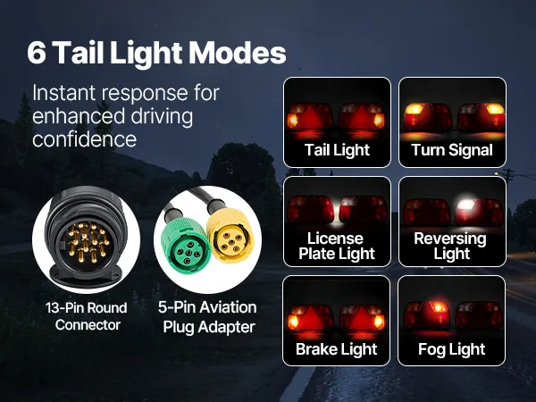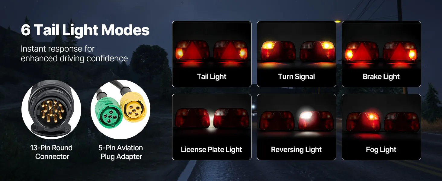 Wielofunkcyjny zestaw oświetlenia przyczepy: Oświetlenie przyczepy oferuje 6 trybów pracy (kierunkowskazy, światło tylne, światło hamowania, oświetlenie tablicy rejestracyjnej, światło cofania i światło przeciwmgielne), umożliwiając wyraźną sygnalizację w każdych warunkach drogowych. Jest zgodne z przepisami ruchu drogowego i spełnia wszystkie wymogi bezpieczeństwa.