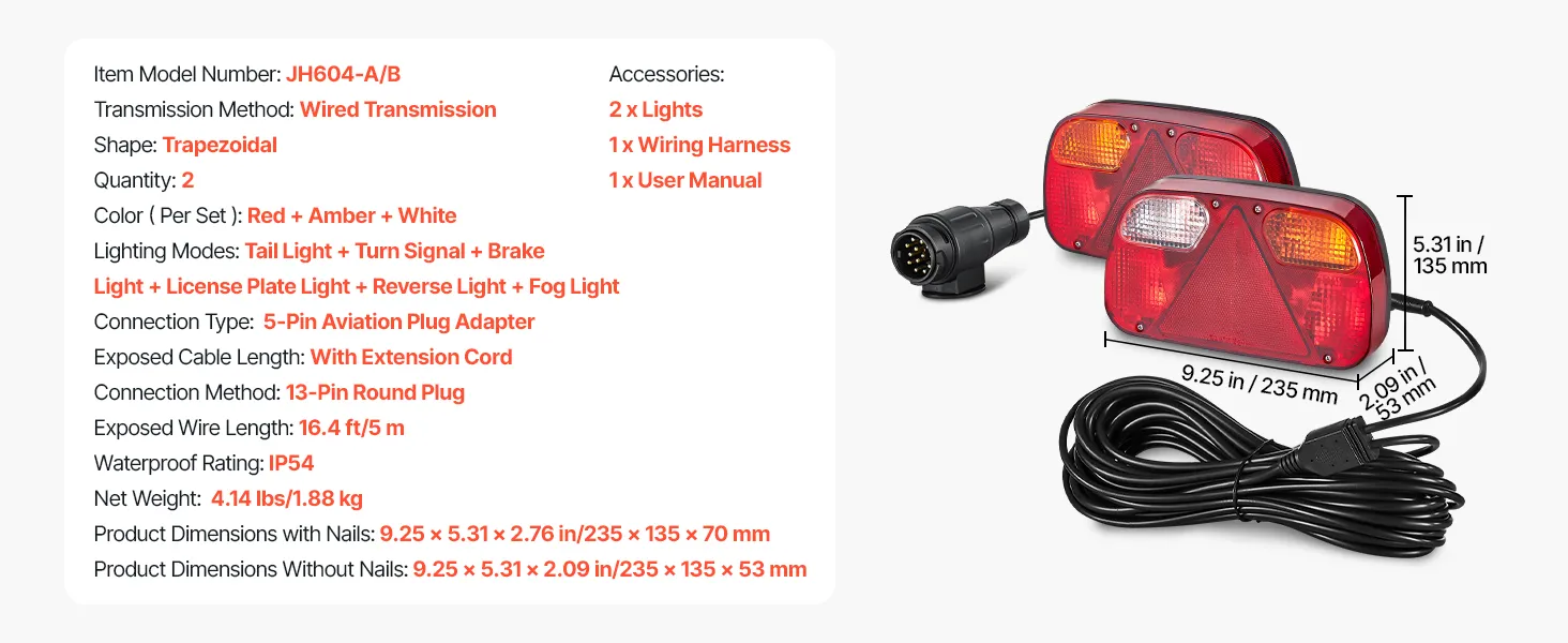 Szybkie podłączenie: Wyposażone w 13-pinową okrągłą wtyczkę, 5-pinowe gniazdo lotnicze i bardzo długi kabel o długości ok. 5 m (16,4 stopy), te wodoodporne lampy do przyczep podłącza się bezpośrednio do puszek przyłączeniowych przyczepy bez potrzeby stosowania dodatkowych kabli lub adapterów. Oszczędza to czas i zmniejsza ryzyko błędów w okablowaniu.