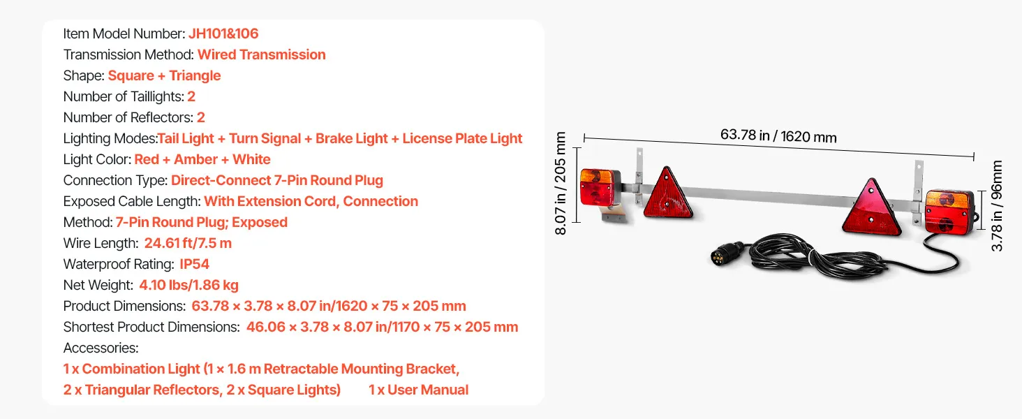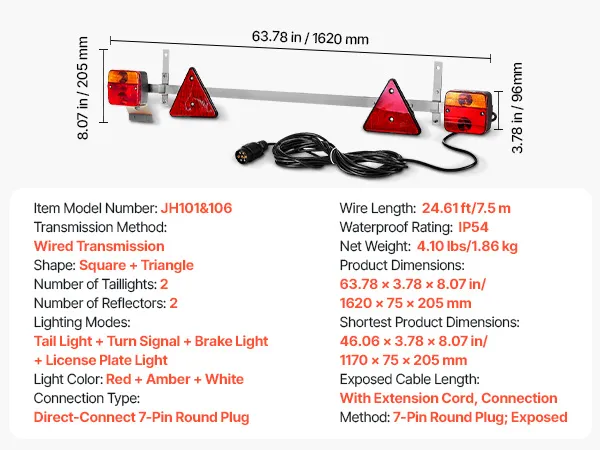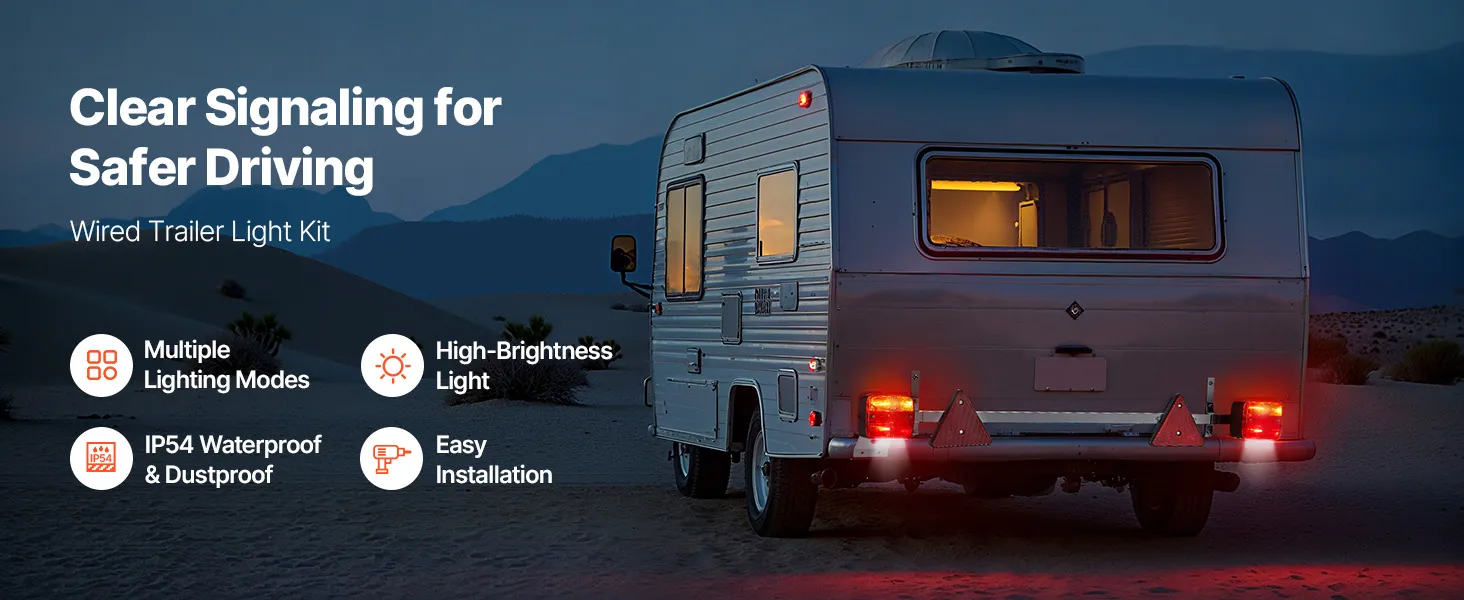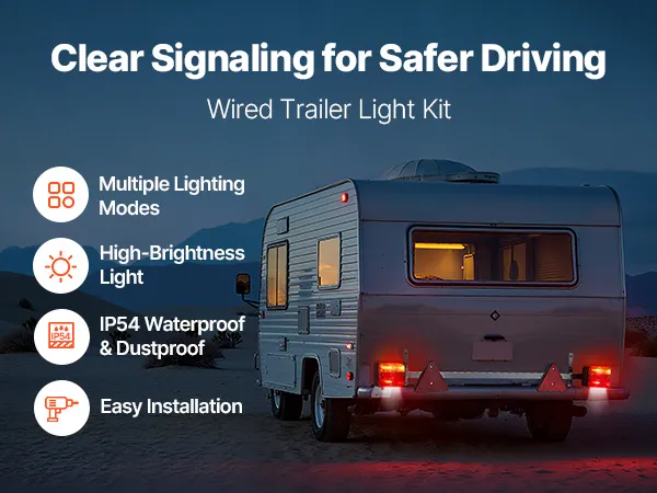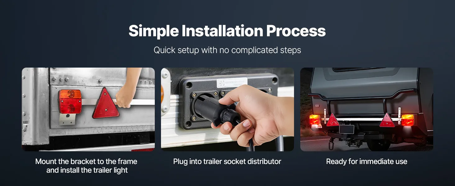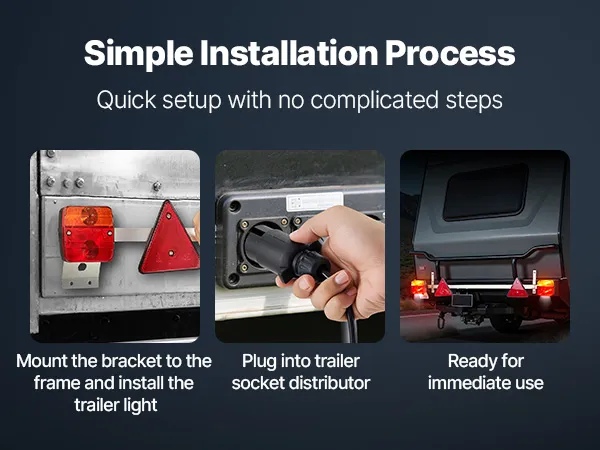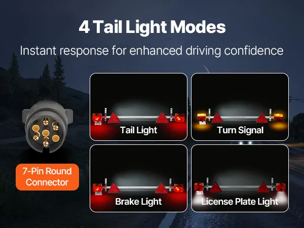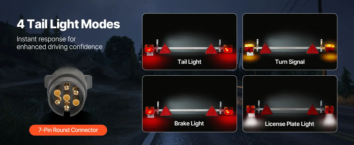 Wielofunkcyjny zestaw oświetlenia przyczepy: Oświetlenie przyczepy oferuje cztery tryby świecenia (kierunkowskaz, światło tylne, światło hamowania, oświetlenie tablicy rejestracyjnej), zapewniając wyraźną sygnalizację w każdych warunkach drogowych. Jest zgodne z przepisami ruchu drogowego i spełnia wszystkie wymogi bezpieczeństwa.
