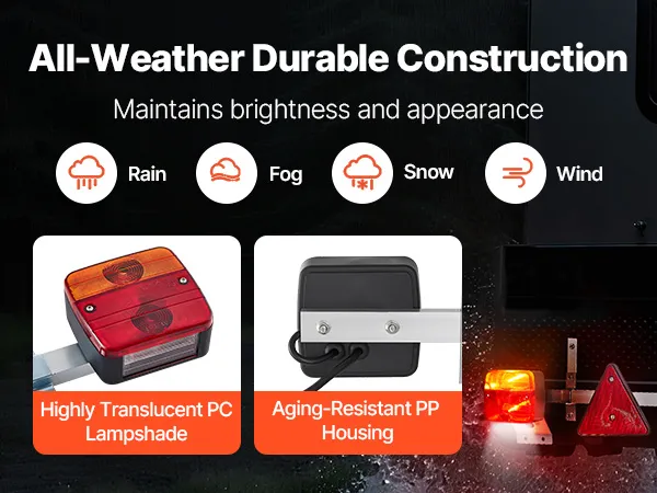Ten zestaw oświetlenia do przyczepy łodziowej charakteryzuje się wysokiej jakości, odporną na uderzenia obudową z poliwęglanu (PC) – przezroczystą, zapewniającą jasne i wyraźne światło. Obudowa z polipropylenu (PP) chroni przed czynnikami zewnętrznymi. Zapewnia jasność i atrakcyjny wygląd zarówno w palącym słońcu, ulewnym deszczu, jak i w warunkach dużego zapylenia.