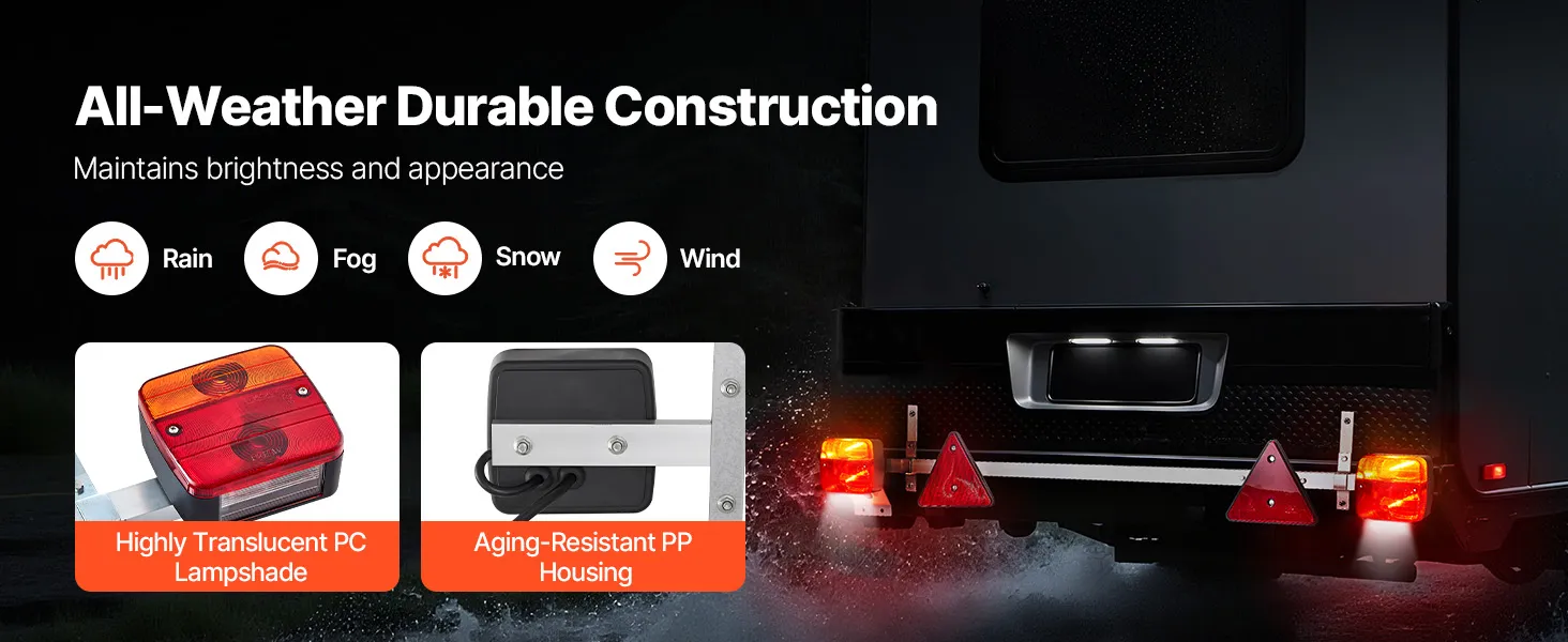 Doskonale widoczne oświetlenie: Ten zestaw oświetlenia przyczepy wyposażony jest w jasne światła z półprzezroczystymi soczewkami PC. Zapewnia doskonałą widoczność w nocy i w niesprzyjających warunkach pogodowych. Wytrzymałe soczewki PC są odporne na uderzenia i warunki atmosferyczne, zapewniając większe bezpieczeństwo podczas jazdy.