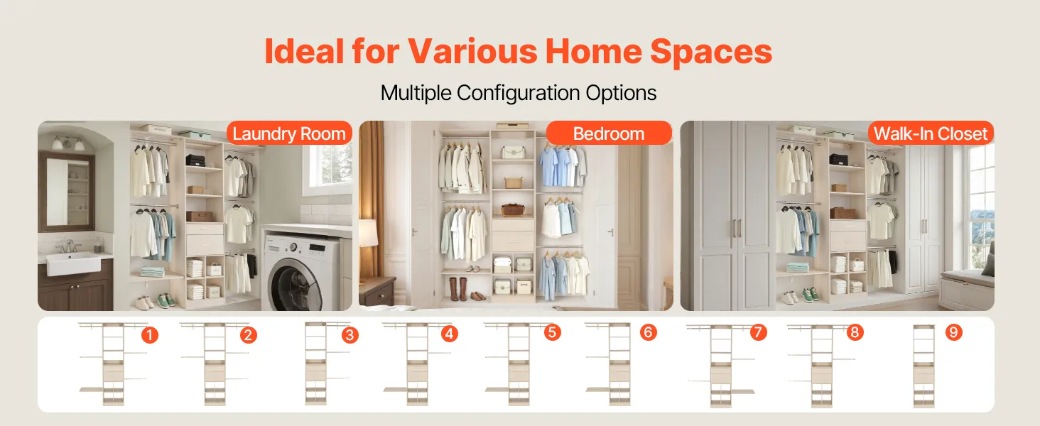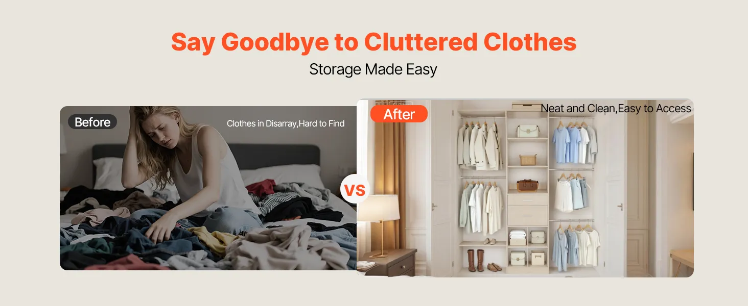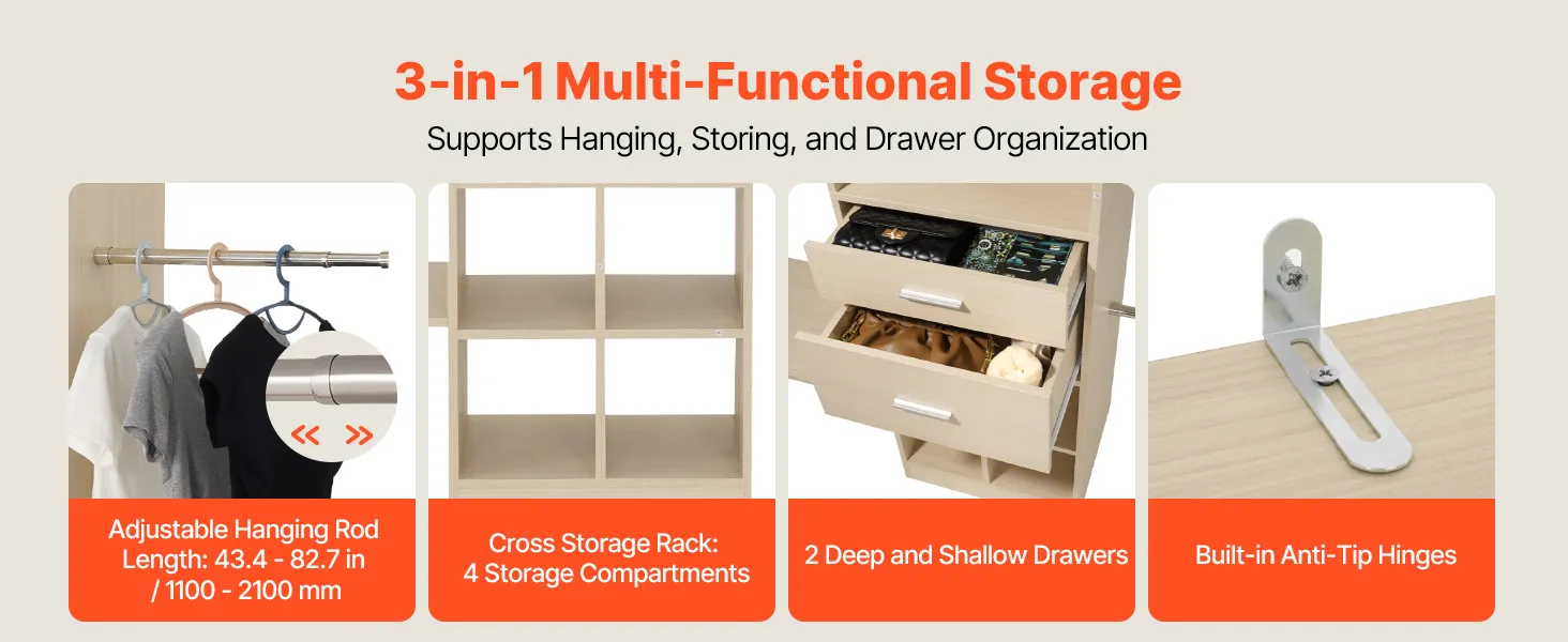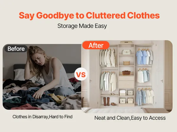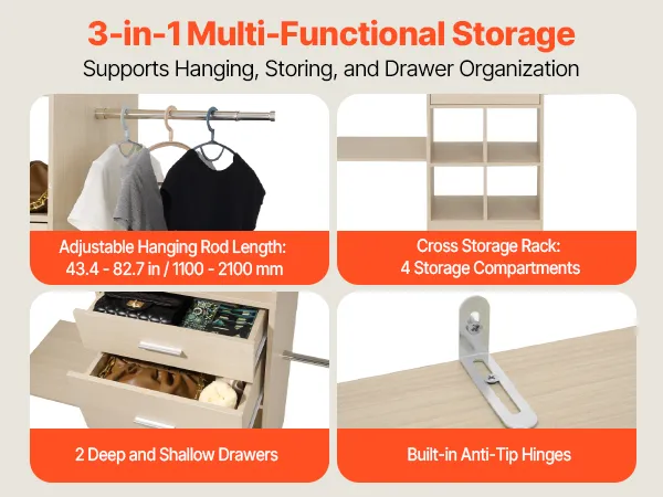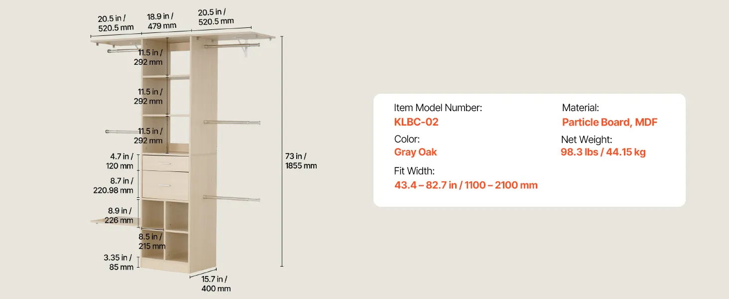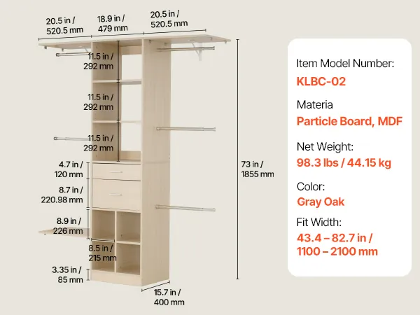 Regulowana konstrukcja: Drążek na ubrania można regulować w zakresie od 46 do 81 cm (od 18 do 32 cali), a półki oferują pięć poziomów wysokości co 32 mm (1,3 cala). W zestawie dwie szuflady zapewniające wszechstronne przechowywanie.