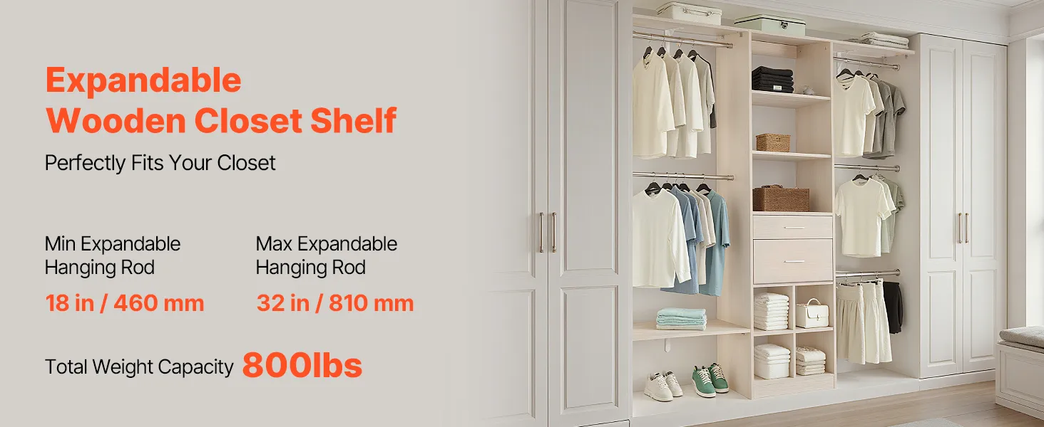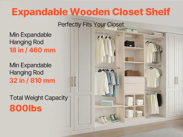 Wieszak na ubrania VEVOR z 2 szufladami, regulowany, drewniany, organizer do garderoby z 5 wysuwanymi drążkami na ubrania (46-81 cm) System do garderoby typu walk-in
